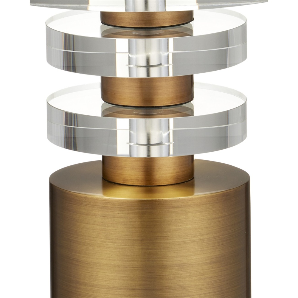 The Shani Brass Drinks Table is made of metal in an antique brass finish and discs of clear optic crystal. The profile of this gold drinks table makes it an excellent choice for mid-century modern interiors, and it will be particularly perfect for rooms that could use pops of bright gold. The cap that fastens the top of this columnar drinks table to its pedestal elegantly rises above the surface, adding a unique and distinctive touch to its clean design.