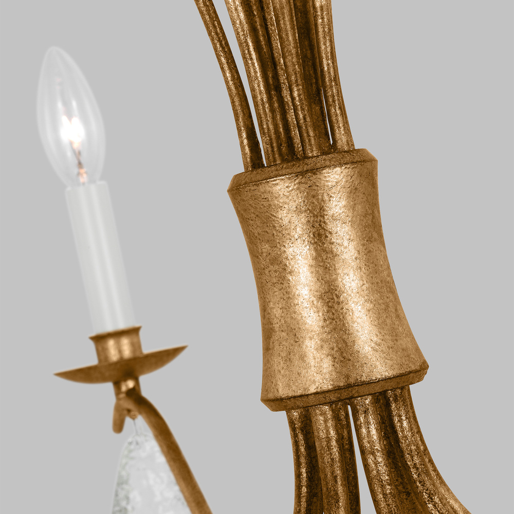 A combination of two things inspired the Shannon eight-light single-tier chandelier in Antique Gild. The frame is based on a vintage chandelier from the Chapman design studio archives, and the glass drops were based on a cast glass vase with a beautiful rippled texture. The metal frame of the chandelier has a curved profile. The one end of each arm supports a light while a glass drop hangs from the other, and the metal arm curves up and around in one continuous visual length. The central hub has the same hourglass profile as the Westerly Chandelier. The signature detail of the design is the unique glass drops with an organic rippled texture that almost resembles melting ice and refracts the light beautifully.
