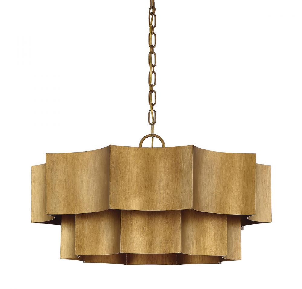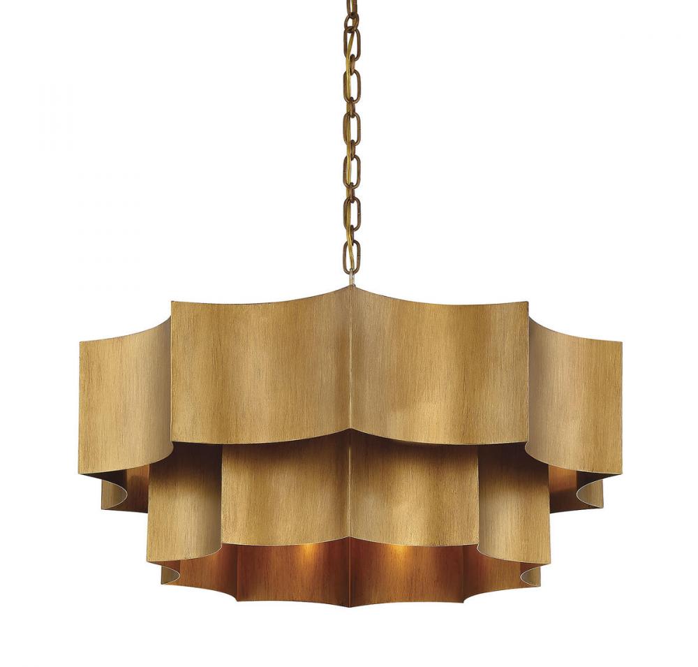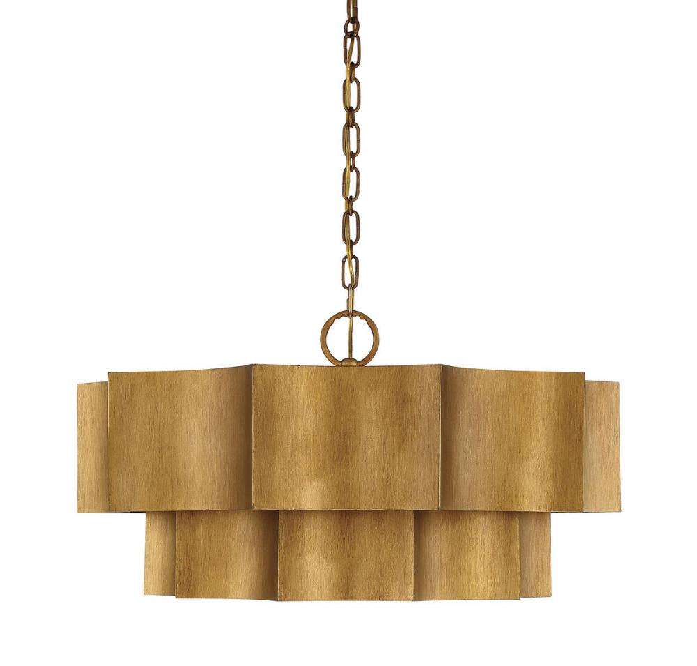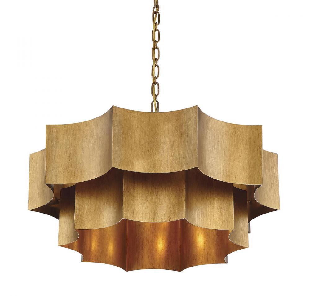 Doubling the wow factor of the original 3-light Shelby pendant, this 6-light version from Savoy House features two stacked bands of delicately crimped gold patina finished metal hanging from a single gold chain. Alluring, upscale and completely unique, this simple yet striking contemporary light fixture is appropriate for almost any spot in the home. It’s a break from tradition in kitchens and dining rooms, and a welcome surprise as bedroom, entry or bath lighting. Compatible with transitional, contemporary and mid-century modern interiors, the Shelby pendant light is also perfect for pairing with contrasting metals like silver cabinet hardware and photo frames to easily achieve today’s popular mixed metal decorating trend.