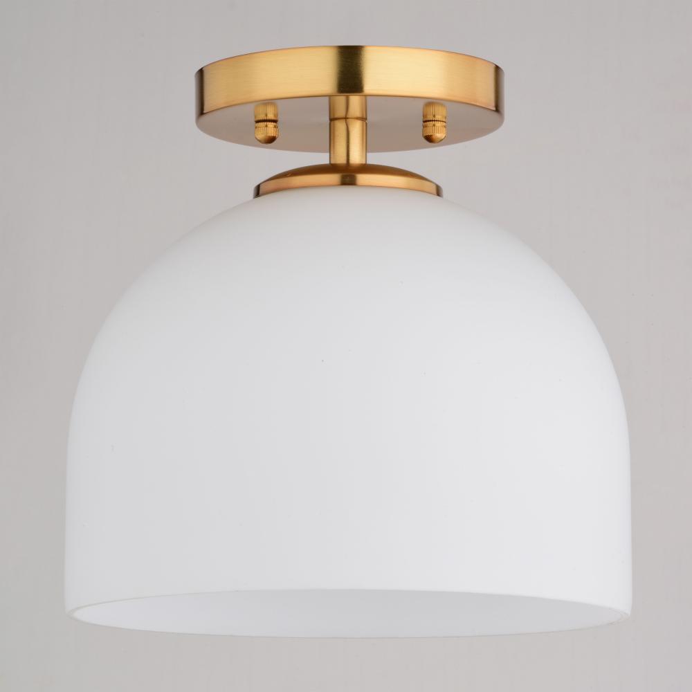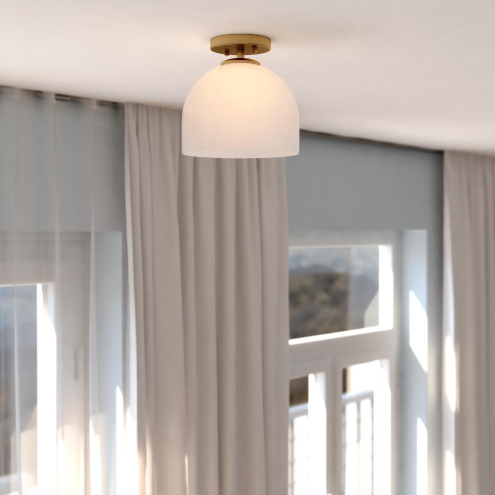 Illuminate your bedroom, bathroom, entryway, or hallway with the Shelby 1 Light Semi-Flush Mount. Its classic design and natural brass finish add a touch of timeless sophistication for both transitional and contemporary spaces. The elongated white dome-shaped glass shade emits a soft, diffused light, creating a warm and inviting atmosphere in any space.