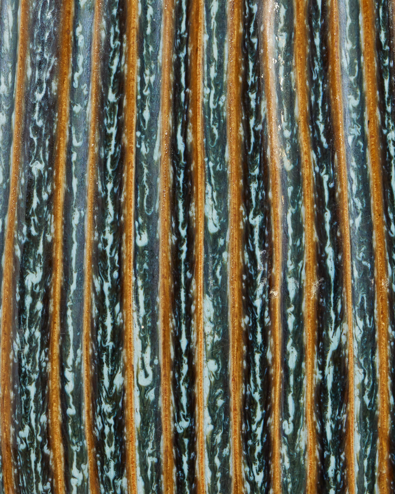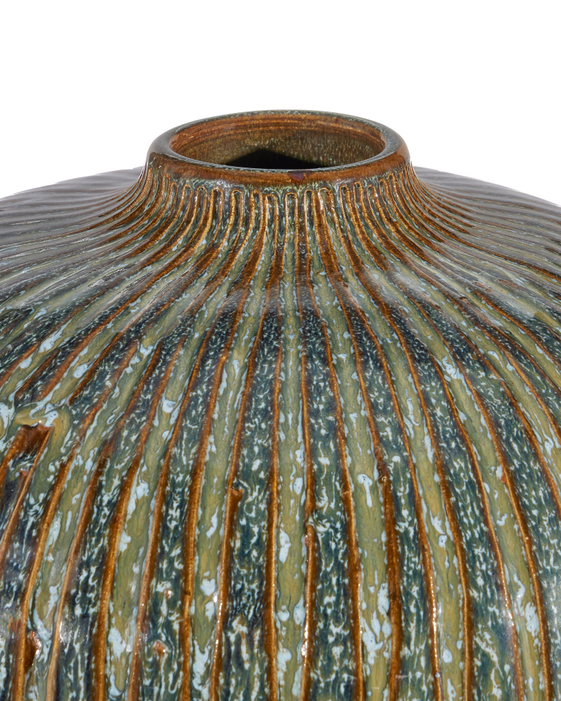 The Shoulder Medium Vase is made of ceramic that is hand-thrown by Thai ceramicists, then intricately decorated with green and brown reactive glazes. This brings the surface of the large vessel some serious texture. The liveliness of the surface will also add a Bohemian vibe to the space it will ornament. Because the glazes are applied by hand, this piece will vary slightly from vase to vase.