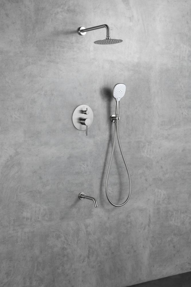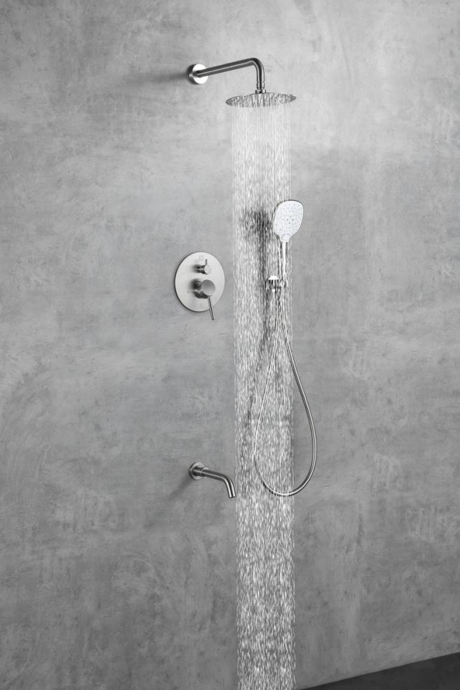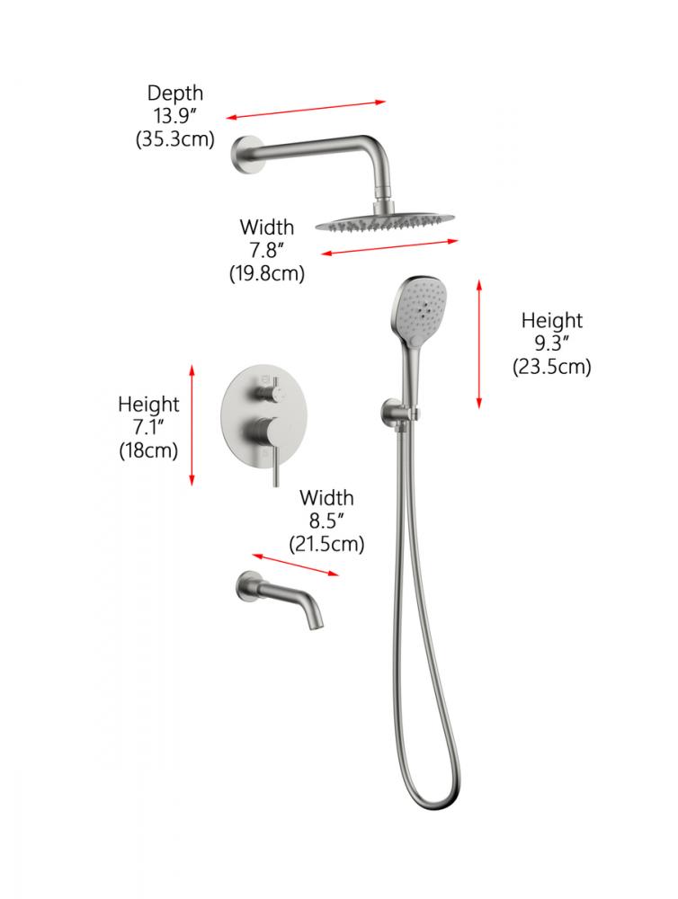 Experience the pinnacle of shower versatility with our shower set, featuring both a handheld showerhead and an adjustable swivel wall-mounted showerhead. Customize your shower experience based on your preference, thanks to the two-handle valve trim providing precise control over water temperature and flow. Seamlessly switch between the handheld and wall-mounted showerheads with our two-valve diverter, offering fingertip control. Tailor your water pressure with the handheld showerhead, allowing for gentle drizzles or powerful streams. Benefit from the flexibility of a 59-inch hose for expanded reach, facilitating convenient rinsing and cleaning. Effortlessly maintain the pristine look and performance of your shower set with rubber-like nozzles that make cleaning a breeze, ensuring freedom from mineral buildup. This package includes a rough-in valve, an 8-inch showerhead, a 14-inch shower arm, an Escutcheon flange, a 59-inch hose, a wall supply elbow, and a 7-inch faucet trim with handles, along with a 9-inch handheld showerhead and 8.5 inch tub spout. Enjoy the luxury and convenience offered by our comprehensive shower set.