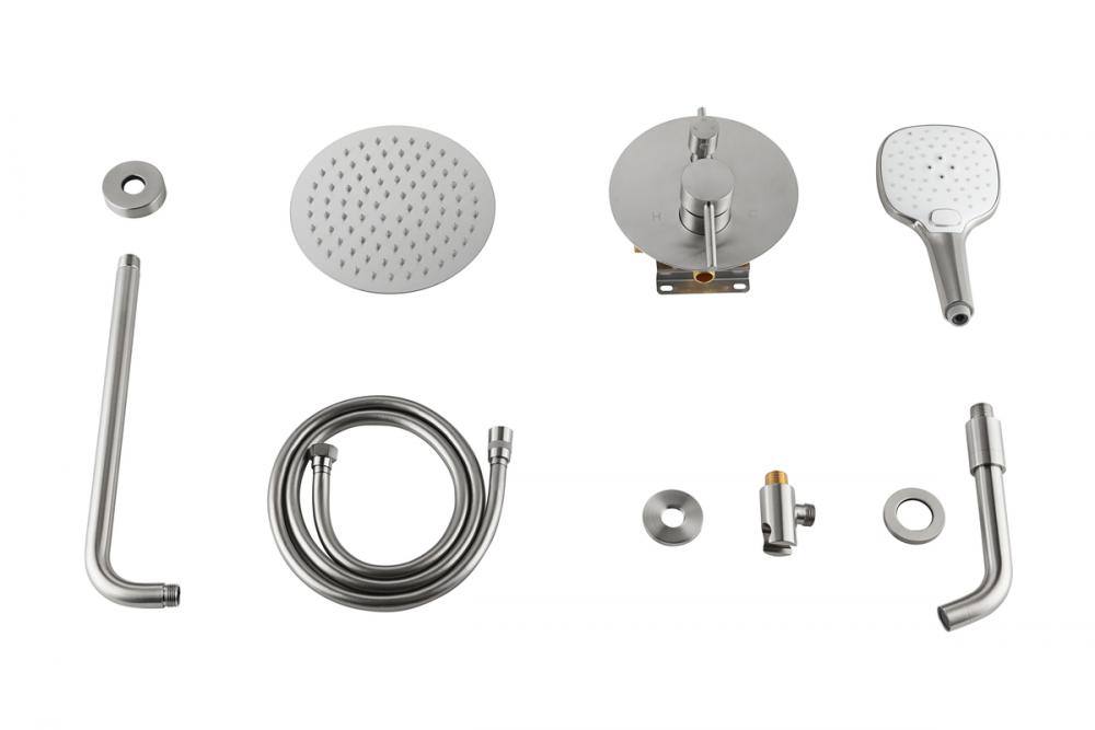 Package includes rough-in valve, 8-inch shower head, 14 inch shower arm, Escutcheon flange, 59 inch hose, wall supply elbow, 7 inch faucet trim with handles, 9 inch hand-held showerhead, 8.5 inch tub spout with flange.
