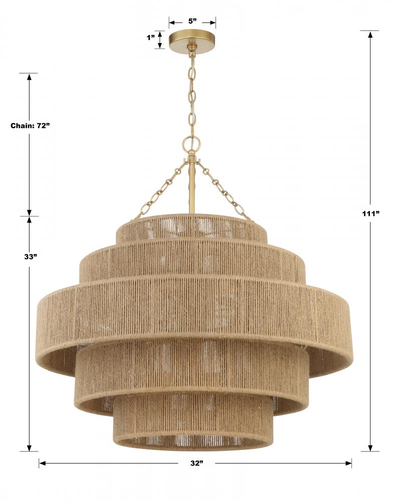 The Shyla Chandelier is a stunning blend of form and function. Crafted with modern sensibilities in mind, it features a tiered jute design and a gold chain adorned with oval and round details. The jute-wrapped structure adds a textural element, creating a relaxed and refined ambiance. With a warm and cozy glow, it is the perfect lighting solution for various interior styles, thanks to its simple and versatile design.