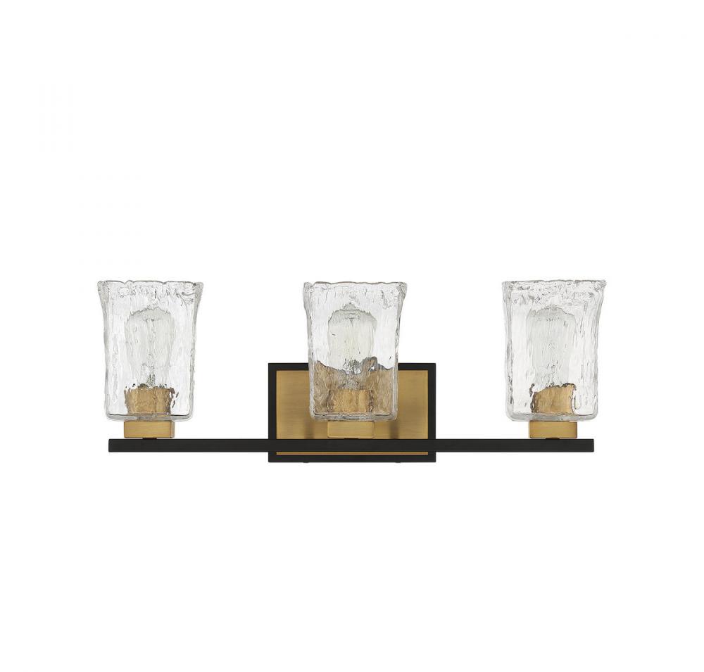 A fashionable blend of matte black and warm brass makes this Savoy House Sidney 3-light bathroom vanity light a bold choice for the bath. Highly textured clear water glass shades add an extra dimension of intrigue. Sidney is 8" in height and 23" in width. It extends 6.75" from the wall. Uses three standard size bulbs of up to 60 watts per bulb. Damp area rated.