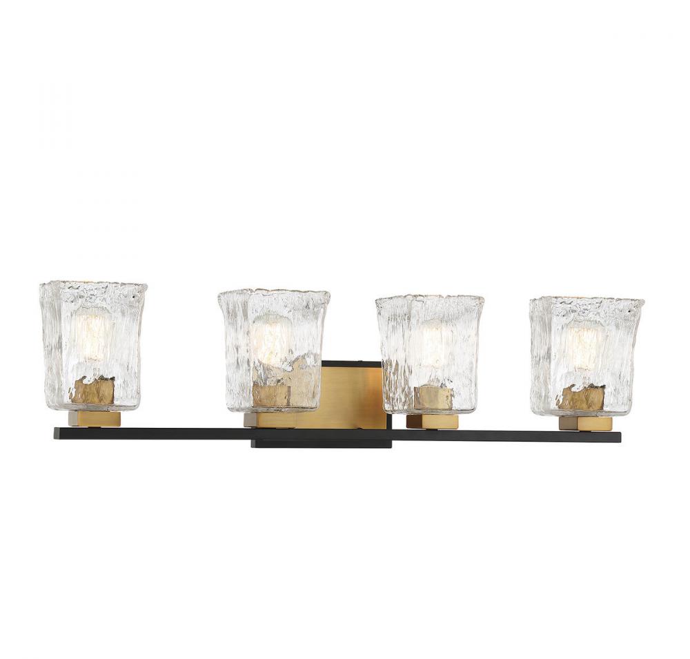 A fashionable blend of matte black and warm brass makes this Savoy House Sidney 4-light bathroom vanity light a bold choice for the bath. Highly textured clear water glass shades add an extra dimension of intrigue. Sidney is 8" in height and 32" in width. It extends 6.75" from the wall. Uses four standard size bulbs of up to 60 watts per bulb. Damp area rated.