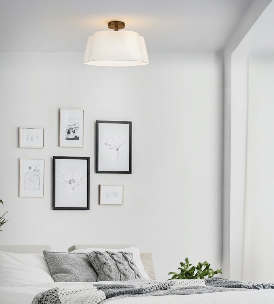 The SIENA semi-flush mount ceiling light embodies understated luxury, offering a design that soothes rather than overwhelms. Its soft white fabric shade with a subtle scalloped edge adds a graceful touch of texture, while the built-in acrylic diffuser evenly casts light into a warm, inviting glow. At nearly 19 inches wide, this 3-light ceiling fixture creates presence without excess, making it an ideal choice for bedrooms, living rooms, or gathering spaces. Designed for three 60W Type A bulbs, SIENA provides ample illumination while maintaining its refined, timeless appeal. With its blend of clean lines and gentle detailing, this fixture enhances interiors with quiet elegance and versatile style.