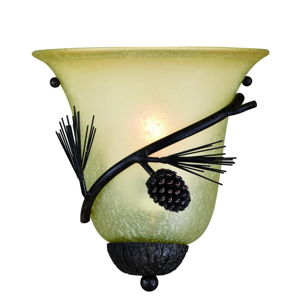 The Sierra collection combines rustic and classic styling that brings nature indoors. Great for lodges, cabins, and nature-styled interiors, this fixture features black walnut finish and frosted scavo glass, with twisted wire rope and pine tree elements.