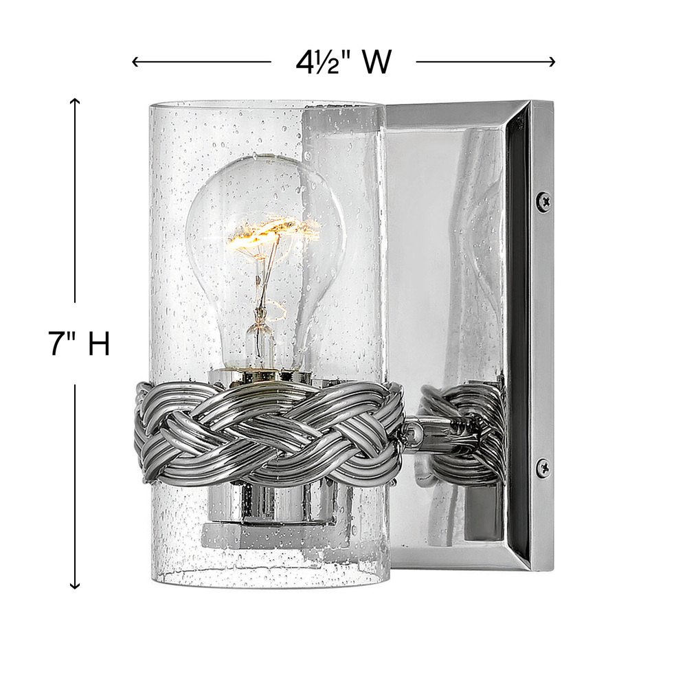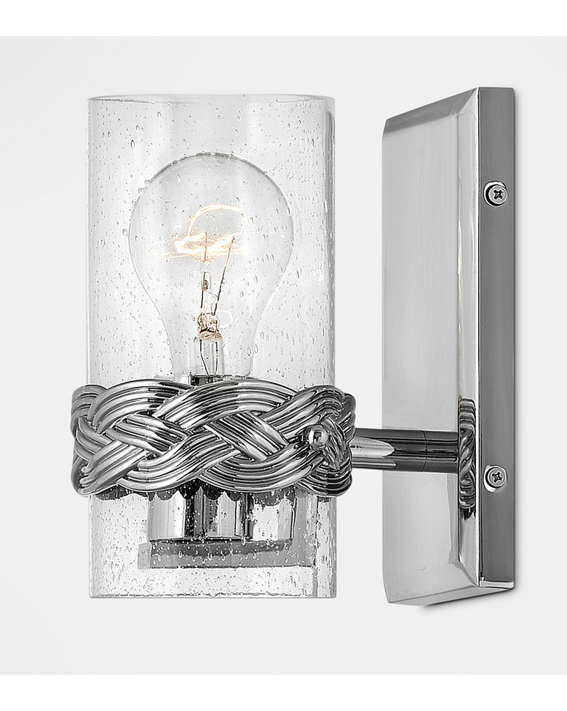 A new nautical classic, Nevis draws inspiration from seafaring style. The intricately crafted interwoven cast bracelet details the strands of a sailor’s knot and envelops vertical clear seedy glass sleeves. A gleaming Polished Nickel backplate adds to the jewel-like effect. Ideal for filament bulbs.