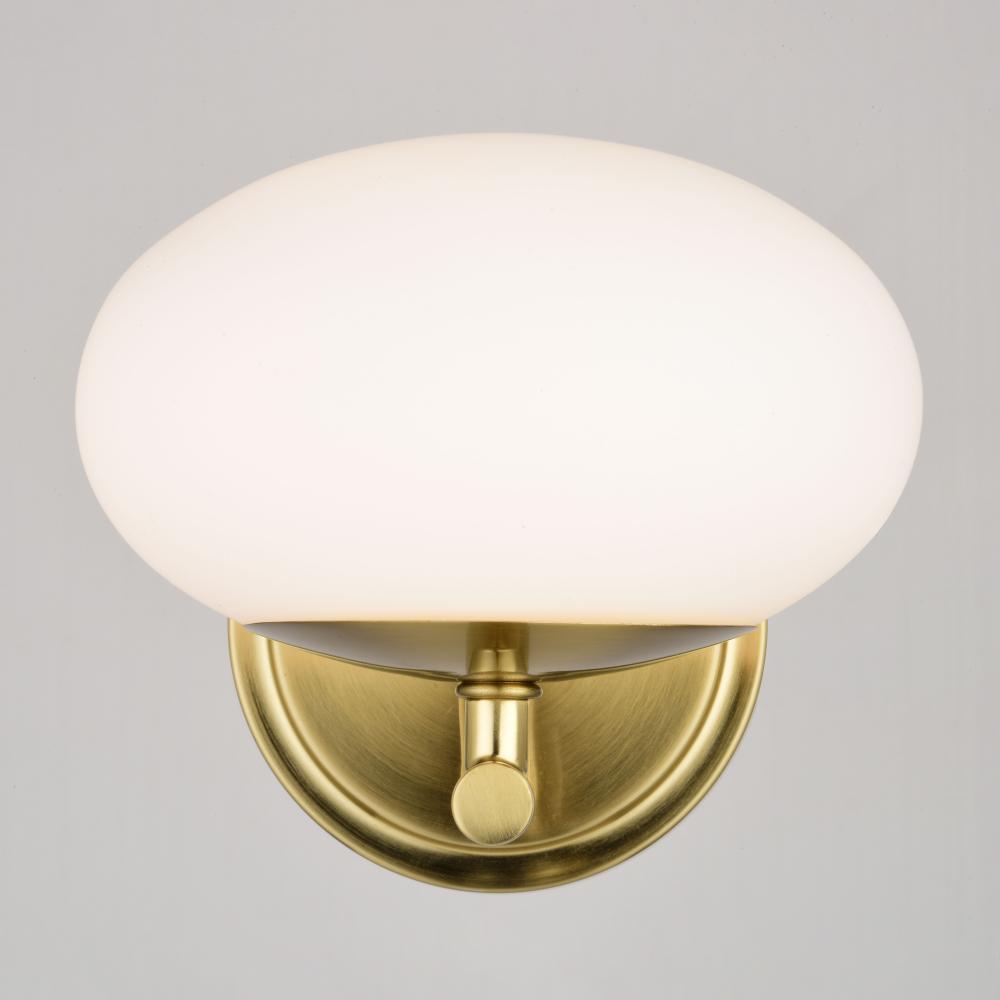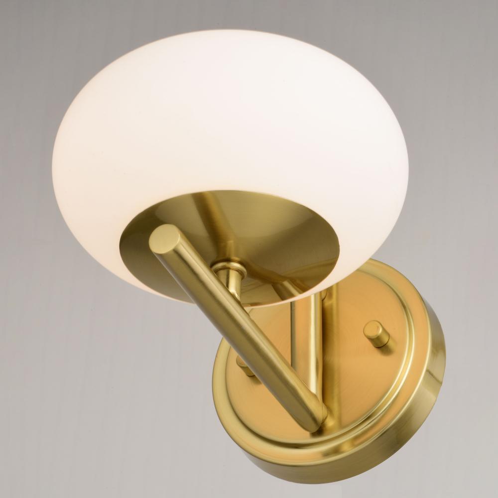 The Sloane collection combines a gold satin brass finish with an opal white glass globe to create an elegant contemporary mid-century modern light for today's on-trend interior spaces. This indoor wall lamp is ideal for a variety of areas including the bathroom vanity, hallway, kitchen, bedside, or anywhere there is a need for extra light.