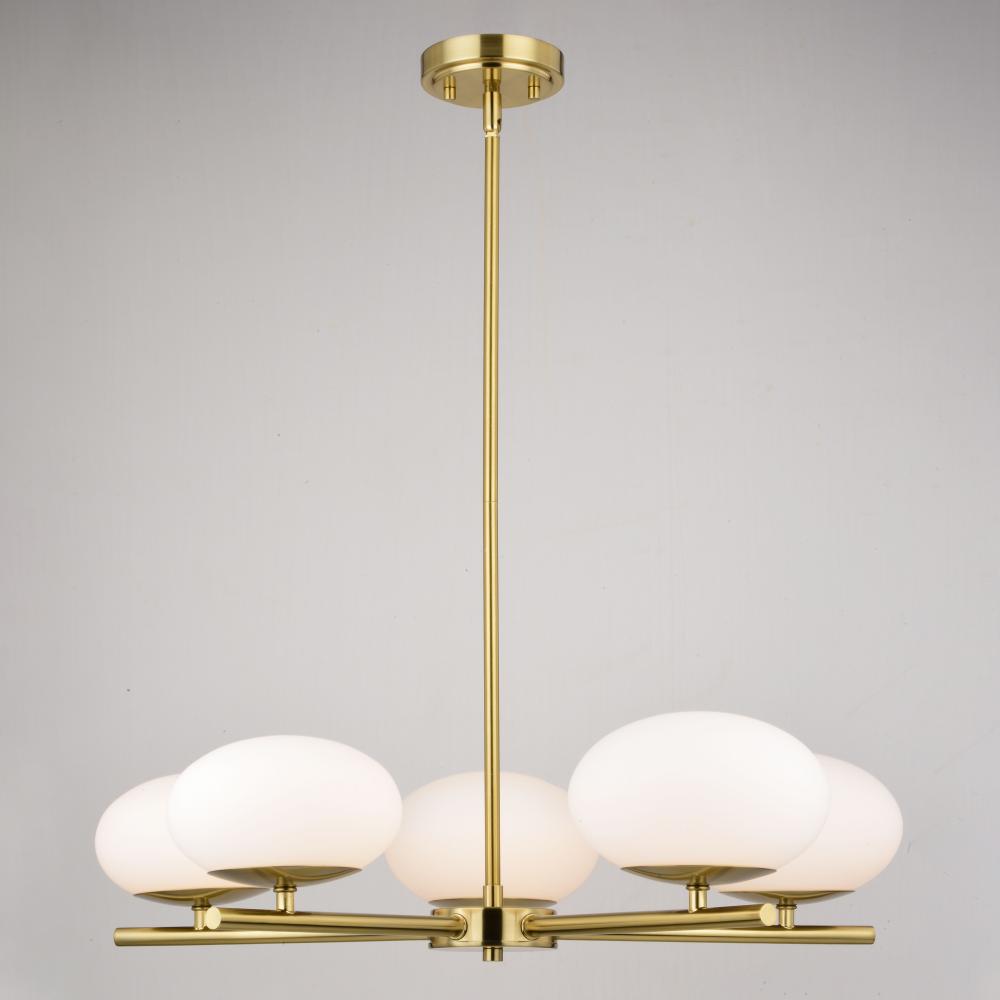 The Sloane indoor lighting collection combines a gold satin brass finish with opal white glass globes to create an elegant mid-century modern light for today's on-trend interior spaces. Hung with downrods suitable for vaulted ceilings, this chandelier light fixture is a perfect addition to your dining area or any other living area where a little extra style is desired.