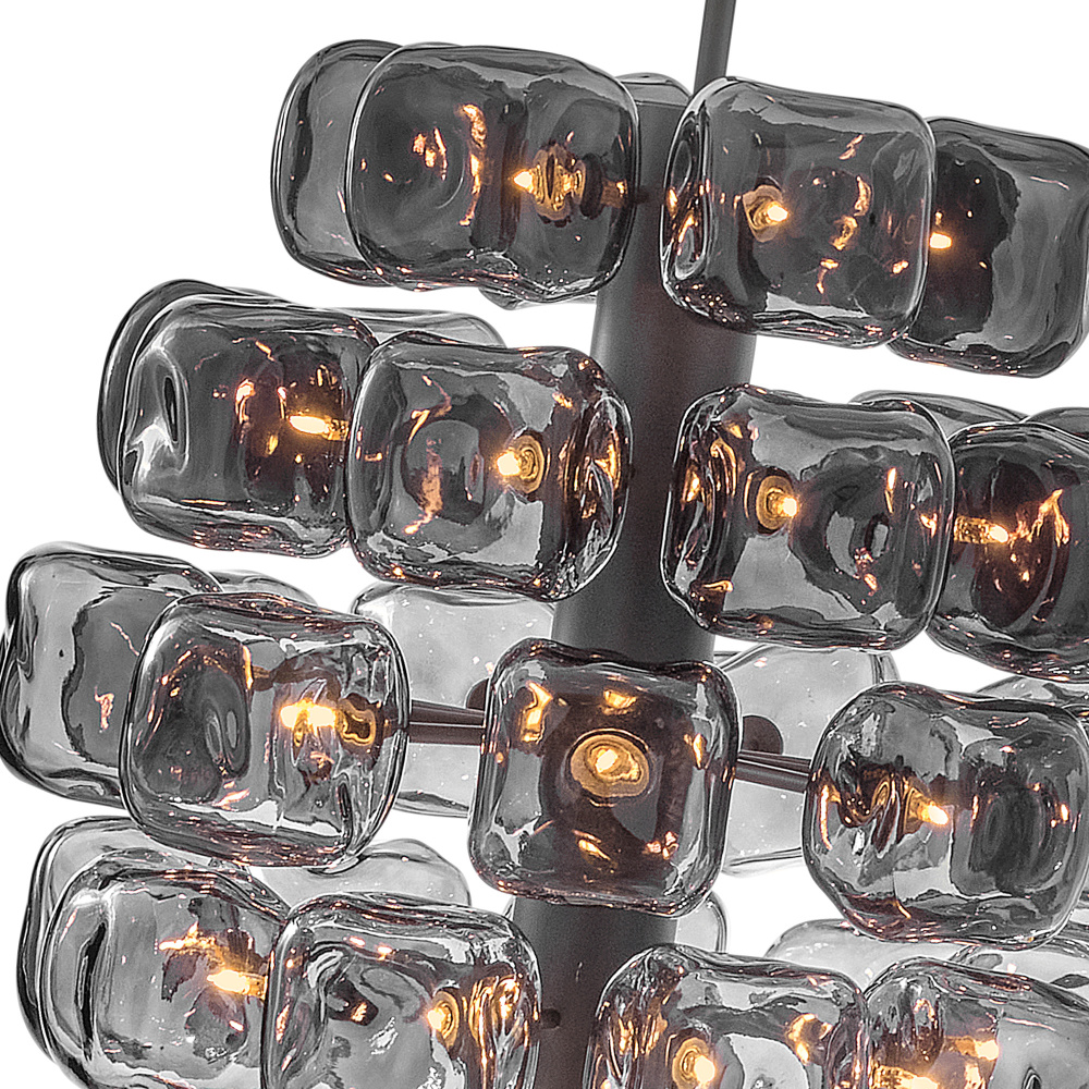Inspired by the glamour of gemstone-adorned jewelry, Perriand’s varying hues are arranged in a striking ombre, transitioning from Smoke or Light Amber glass to clear glass. An intricate frame, rounded canopy, and slender stem in timeless finishes complete this contemporary art piece, making a striking modern statement in any setting.