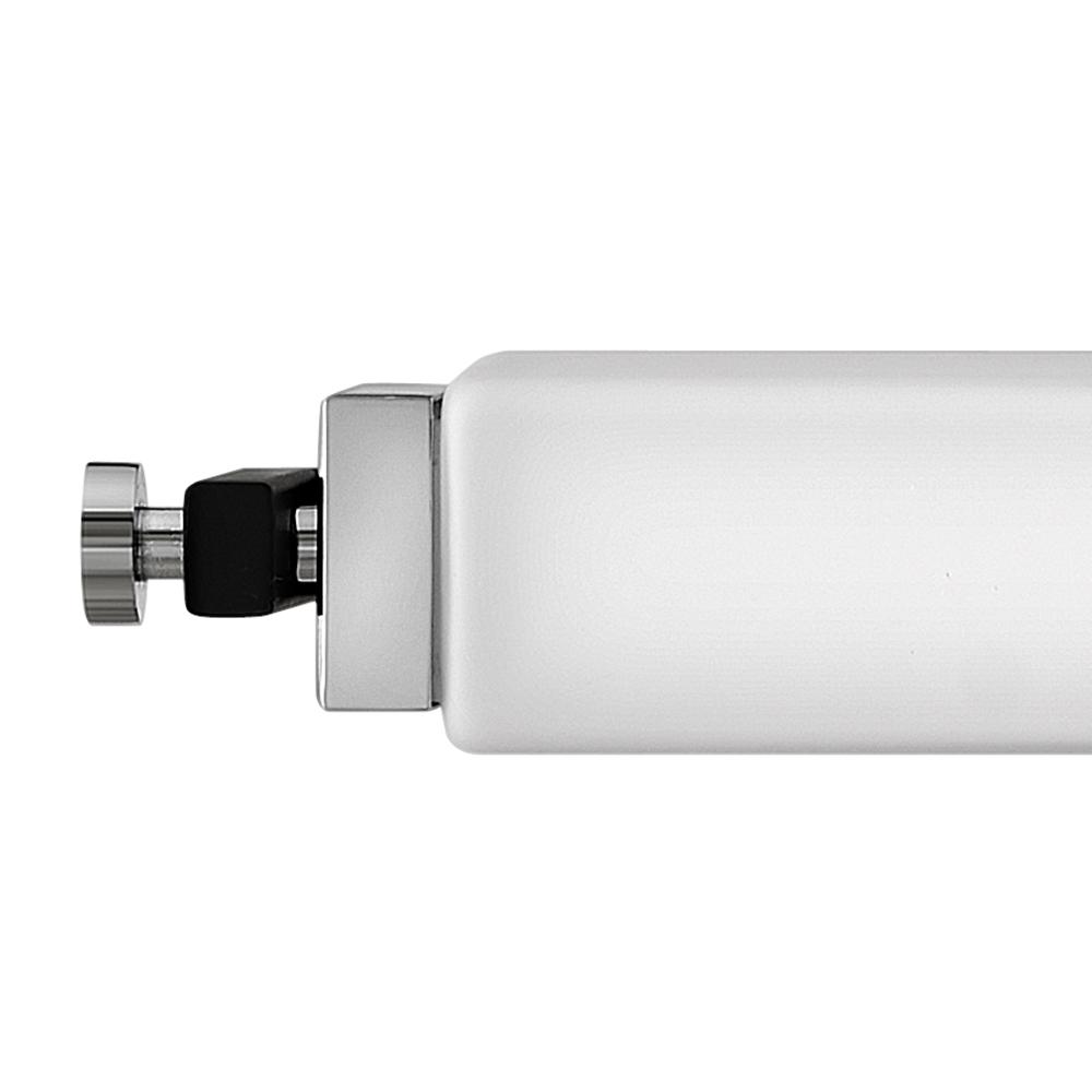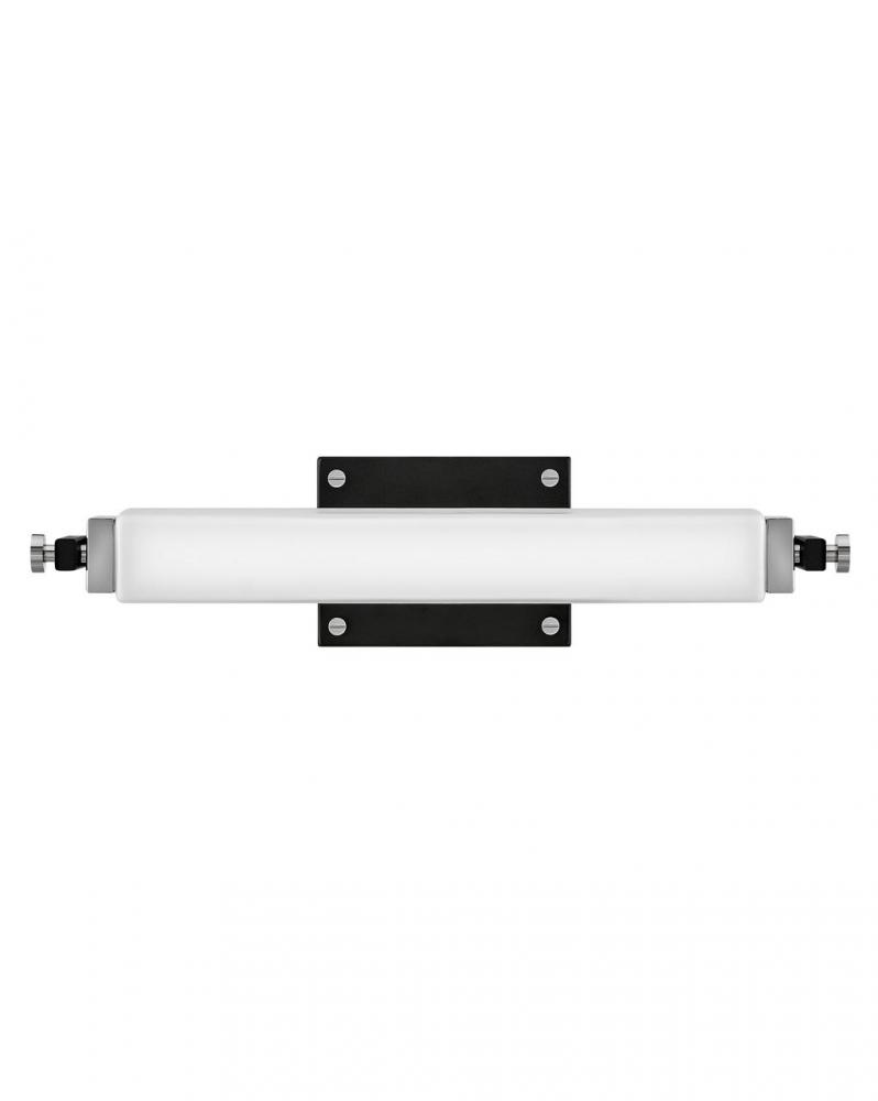 Rollins is both industrial in form and transitional in style. Unique rectangular etched opal glass has softly rounded edges offset by contrasting details on the backplate and the square knobs anchoring either end. This integrated LED design comes in two finish combinations, Black with Chrome and Black with Heritage Brass, and can be hung both vertically and horizontally.