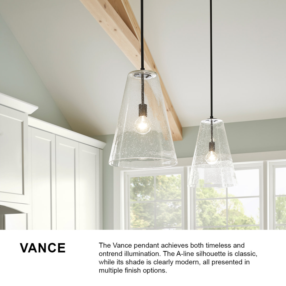 The Vance pendant achieves both timeless and on-trend illumination. The A-line silhouette is classic, while its shade is clearly modern, all presented in multiple finish options.