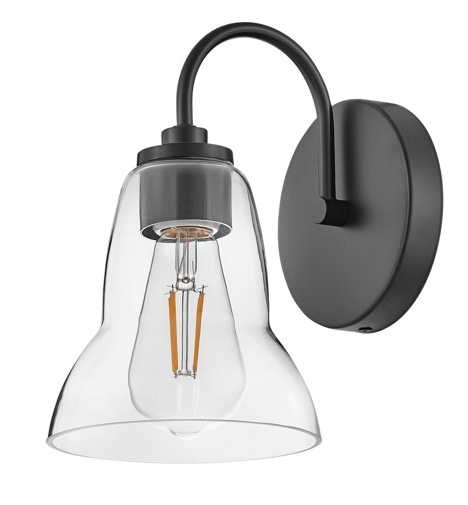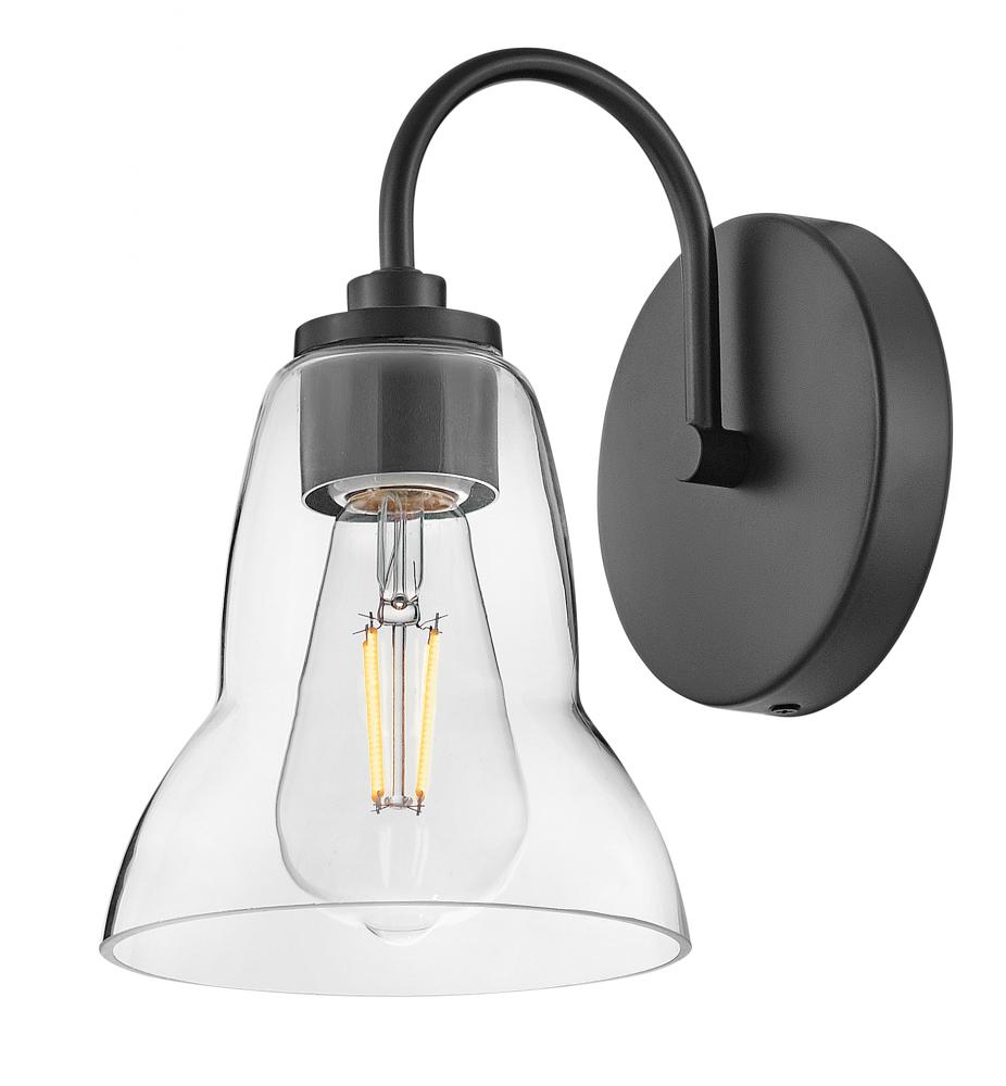Vera’s unique, shapely form takes the traditional bell-shaped shades to a new level. Plenty of light shines up or down from the clear glass, making it a functional choice for main baths and powder rooms alike. Finished in Black or Lacquered Brass, Vera’s chic profile brings transitional style to any space.