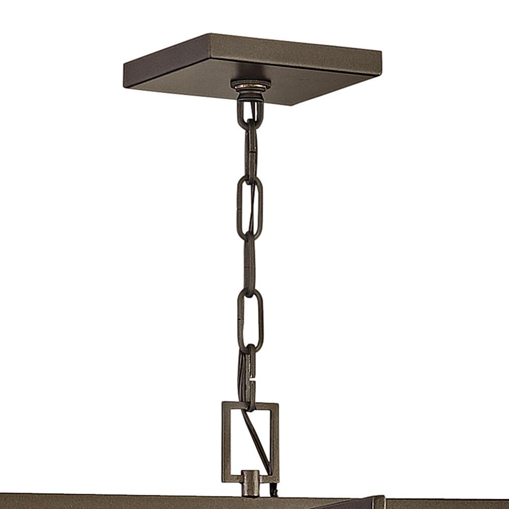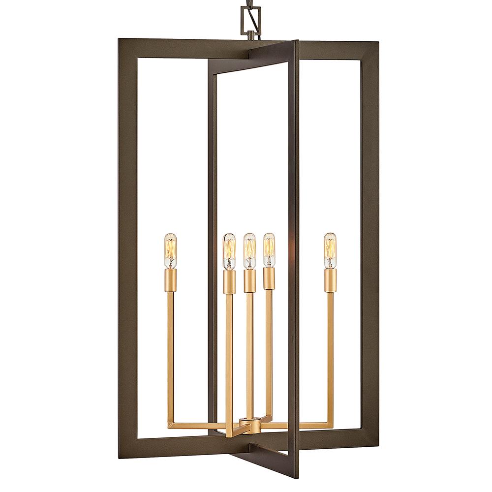 Anders is a staunch supporter of mixed metals and shapes. Metallic Matte Bronze finish rectangles intersect to create the boxy, open outer frame as the circular, spoked Deluxe Gold accent finish candelabra branches out from inside. These contrasting but complementary elements make a powerful contribution to a transitional décor.