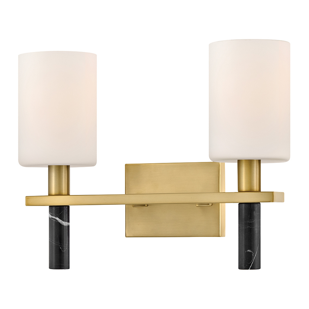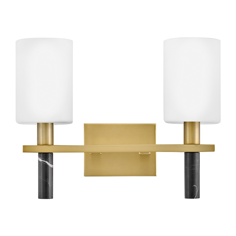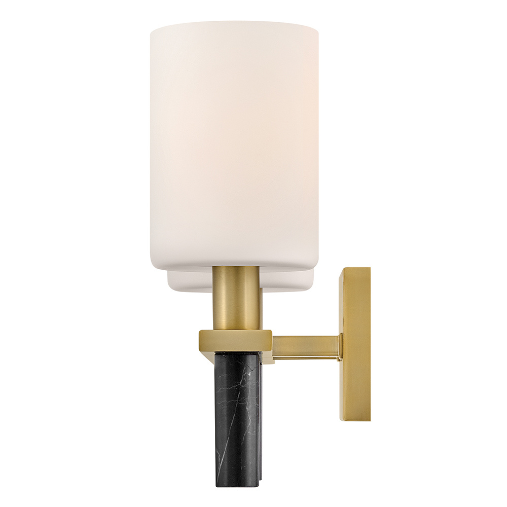 Polished with an understated silhouette, Turin is elevated by tall Etched Opal Glass and luxurious black marble stems. A minimalist backplate finished in vibrant Lacquered Brass complements the natural stone with an elegant touch of warm color.
