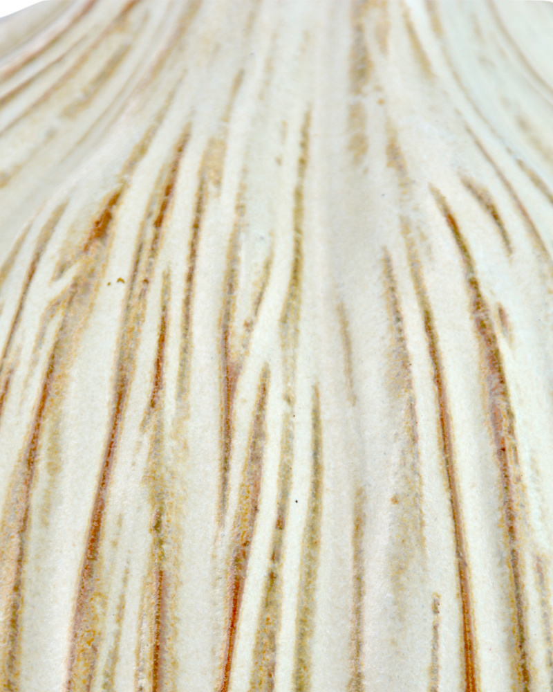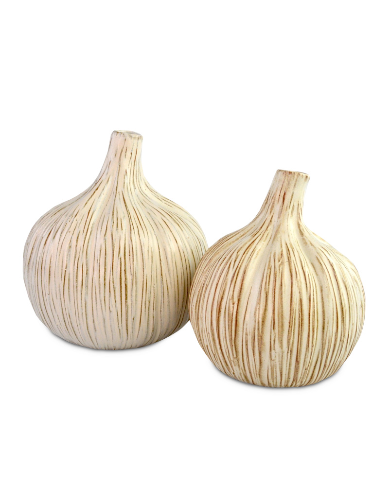 The Small White Garlic Bulb is a sculpture inspired by Provençal pottery found in many of the small towns in the South of France. Made of terracotta, the milky white accessory has striations in the surface that are created when the glaze is scraped away to allow the natural color of the material to show through.