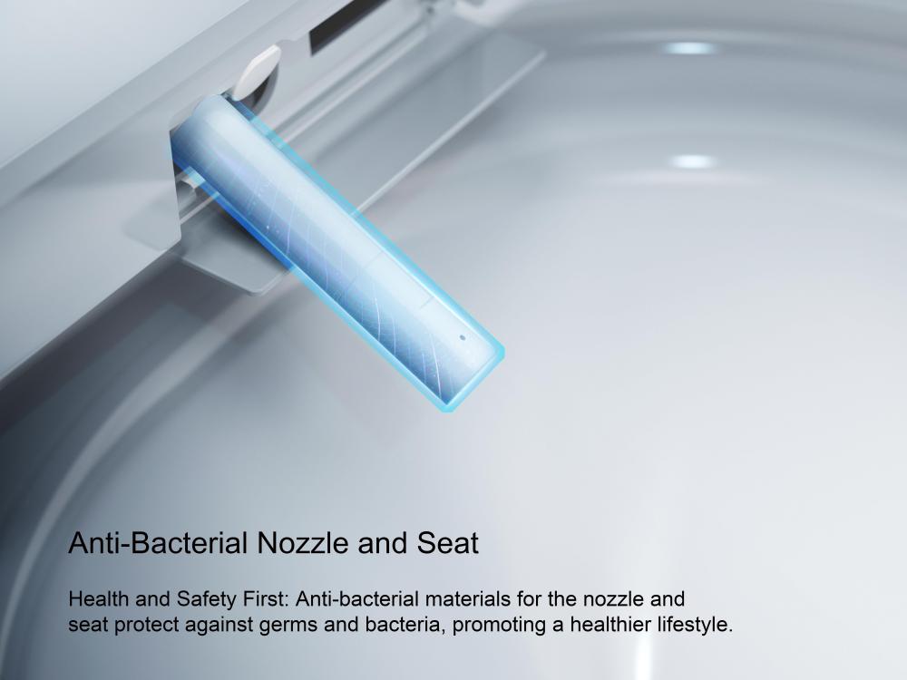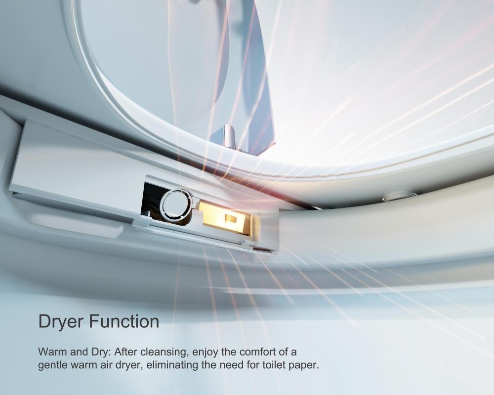Adjustable bidet with different options for a thorough cleaning experience such as adjustments for the water temperature, dryer temperature, seat temperature, massage setting, and spray setting.