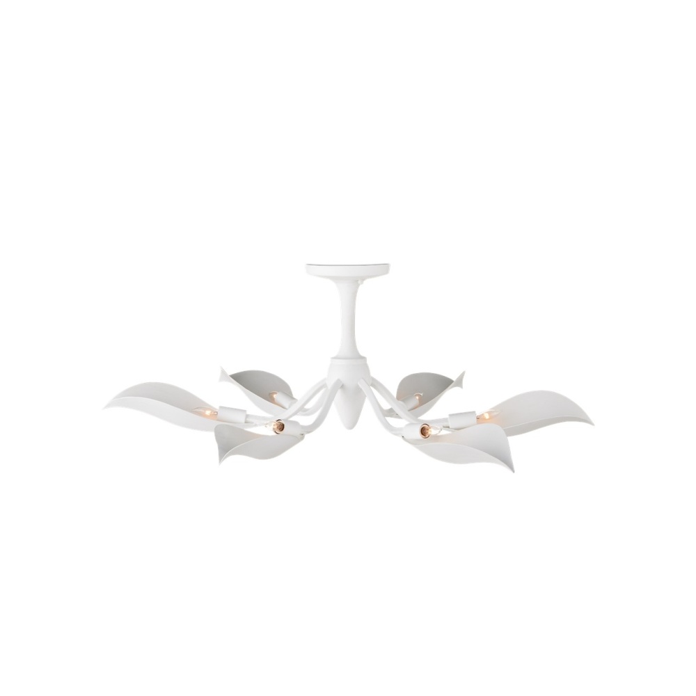 The big, beautiful blossoms of the Snowflower Semi-Flush Mount and the frame they flow from are made of wrought iron in a gesso white finish. Nodding toward the ceiling, the slightly folding petals direct the light upward. The crisp color of the finish will enhance the coolness of the illumination to create more brightness. The white semi-flush with its wild botanical personality will reflect any number of design styles with grace.