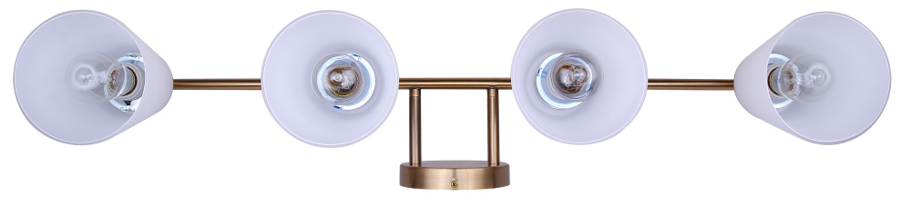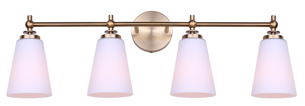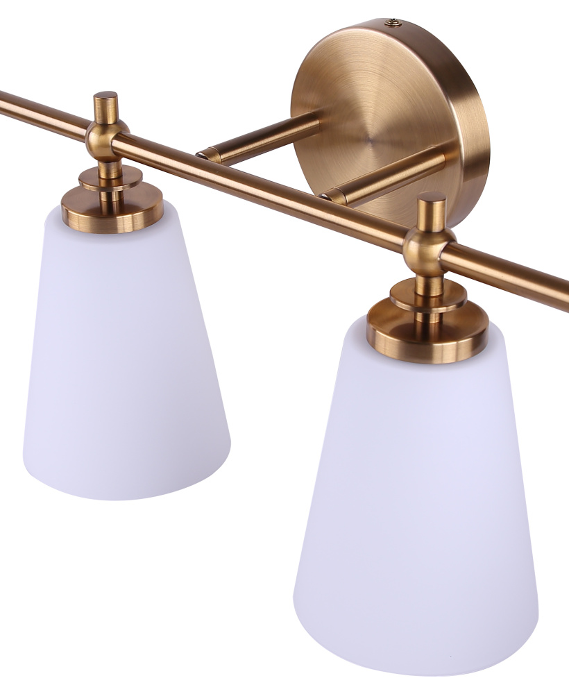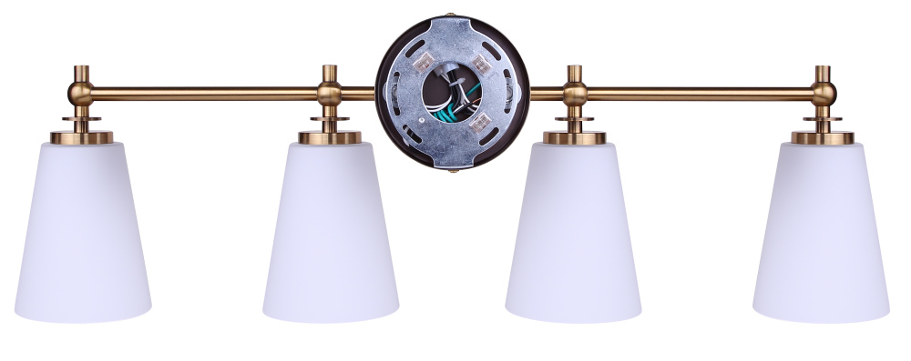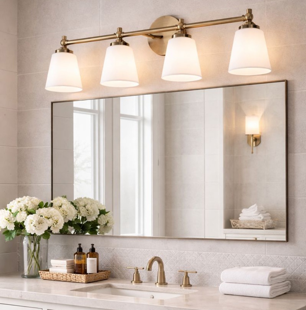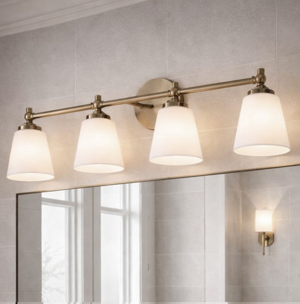 Maximalist-Inspired Design: A warm gold finish paired with four opal glass shades creates a look influenced by Art Deco geometry and modern glam. The result is a vanity fixture that blends subtle drama with versatile elegance.