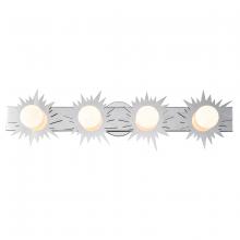 A 32" x 8.5" x 4.5" sun-shaped 4-light bath bar in mixed metals. Ideal over double sinks or mirrors, it brings whimsical texture and drama to bathrooms.