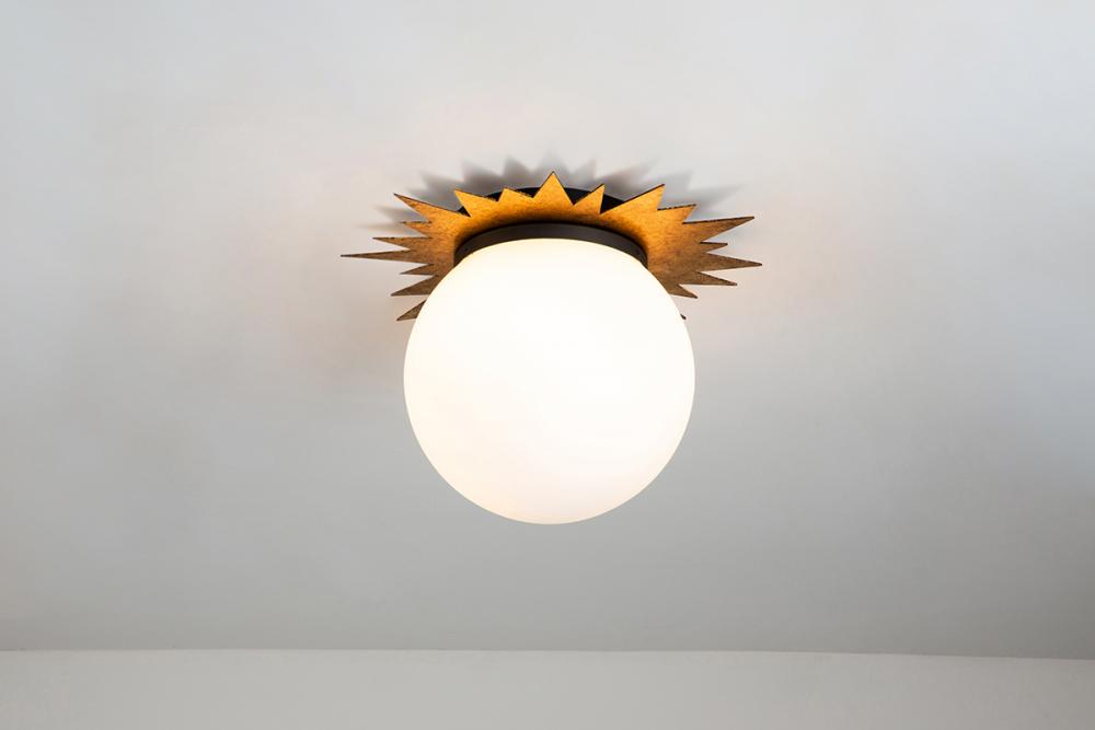 A whimsical 15" dia. star-shaped flush mount in antique gold. This 3-light fixture adds drama and texture to bathrooms, kitchens, or nooks. Its sun-inspired design creates a sophisticated, artful focal point with a warm, weathered glow.