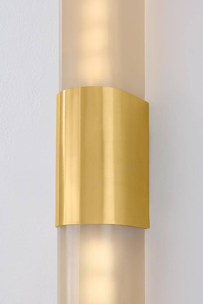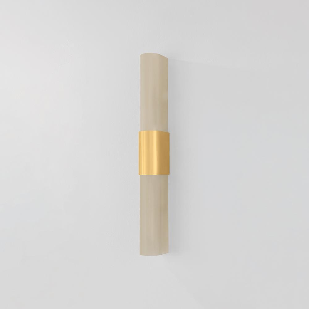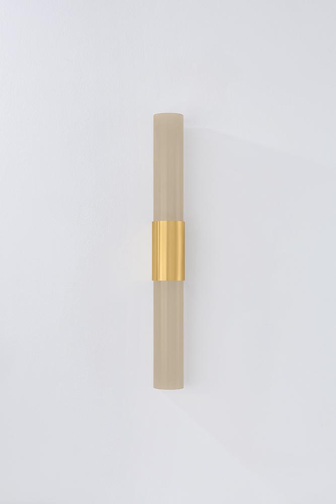 Melding bronze glass with sleek metalwork, the Somersville family includes two timeless, versatile sconces. Suited for a variety of small spaces, the bullnose shape of these fixtures creates a monolithic look. The light bronze glass is etched inside, creating a softly patinated appearance that conceals the light source. When illuminated, the Aged Brass finish of the metalwork glints off the glass shade.