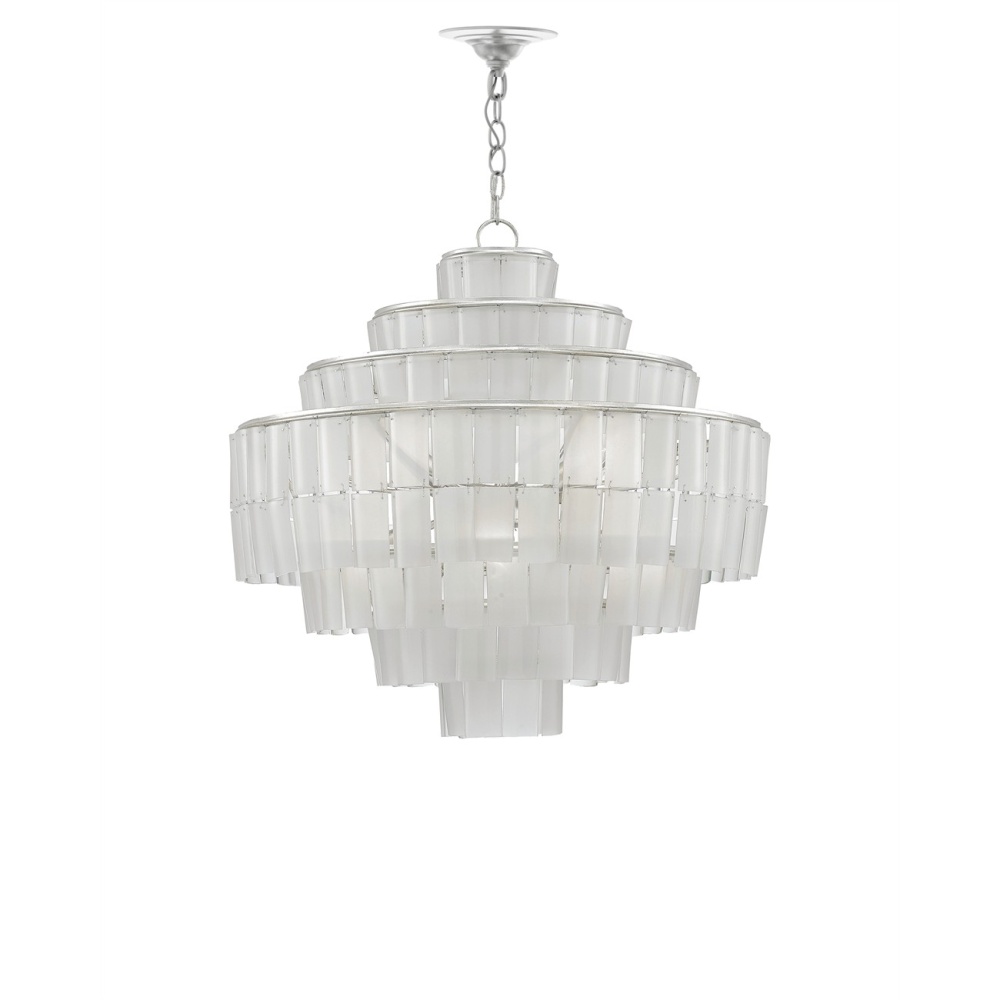 Each layer of the Sommelier Blanc Chandelier is made of individually-cut pieces of frosted glass sourced from recycled bottles. Each piece is textured and unique in its own way to enhance the frame's bright contemporary silver leaf finish. Due to the nature of recycling and the variations in tones, each of these eight-light fixtures is one of a kind. We also offer a version of the Sommelier with green glass. If you prefer a cascading shape, take a look at our Vintner chandelier the same glass.