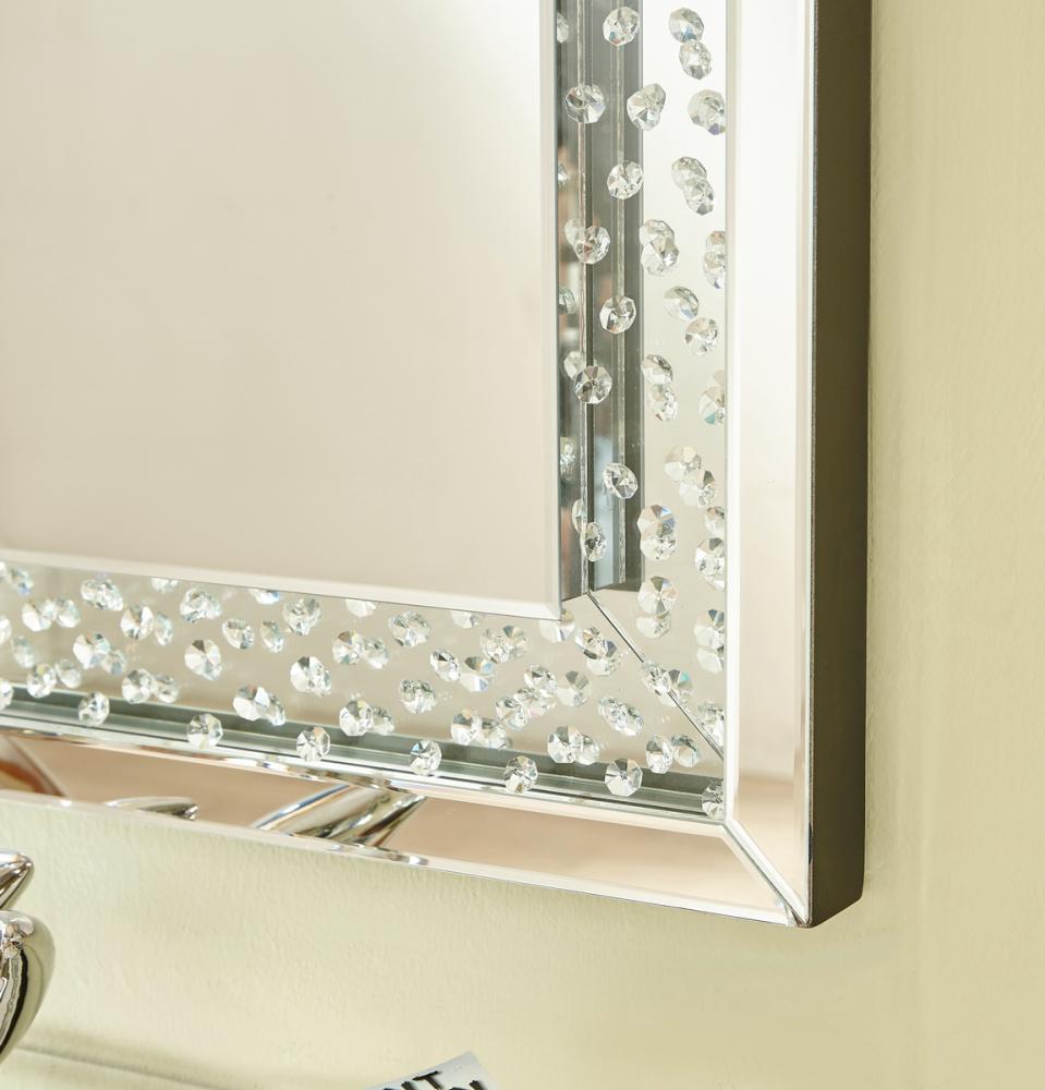 Make a striking statement in your home or office with this stunning contempo style clear mirror. Featuring dozens of expertly cut, beveled edge mirror pieces, layered together to create a bold, yet elegant textured look, you can adorn any promintnt wall with this dazzling contemporary mirror and be sure to catch people’s attention. · Contempo rectangle clear mirror · Mirrors and all surrounding panels are made with beveled edges