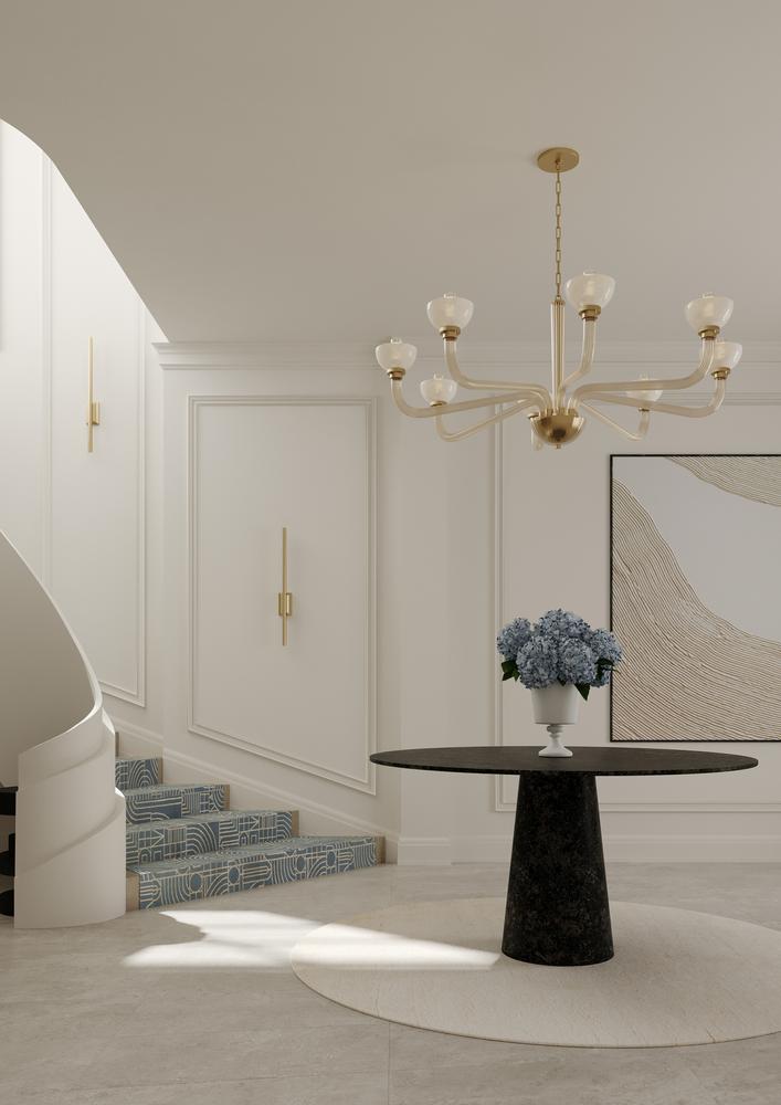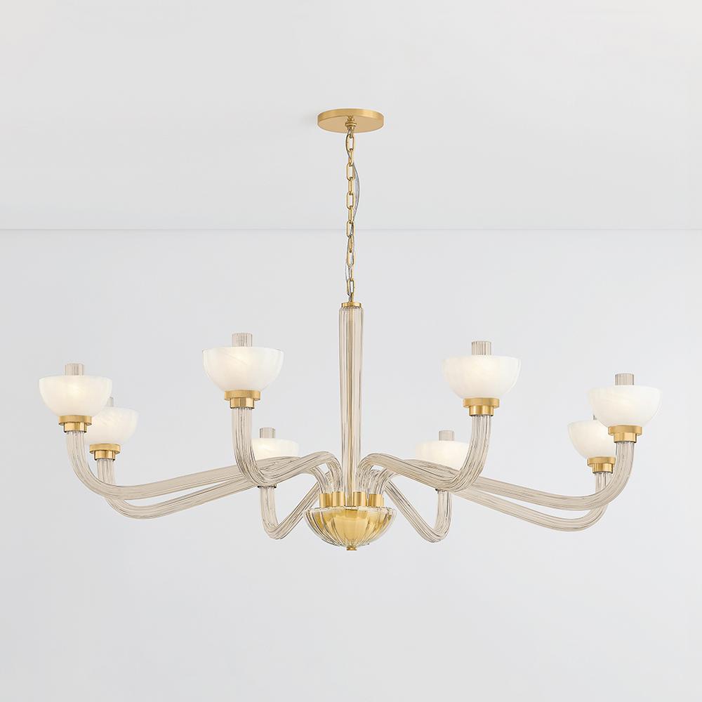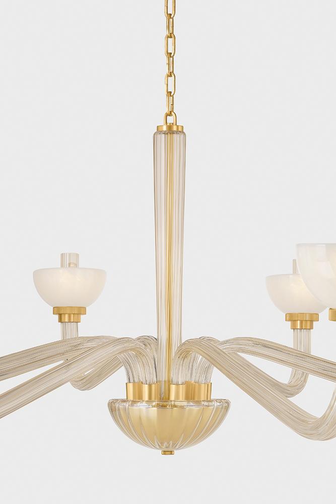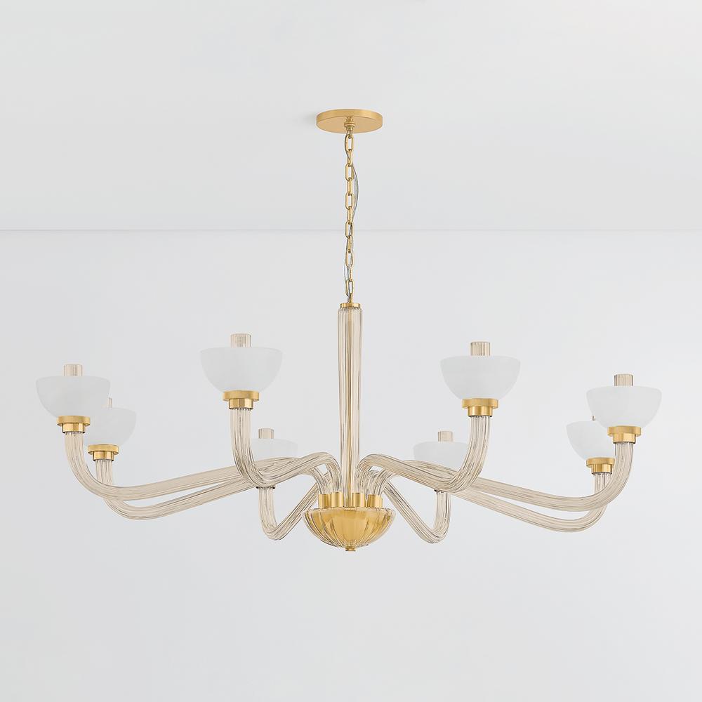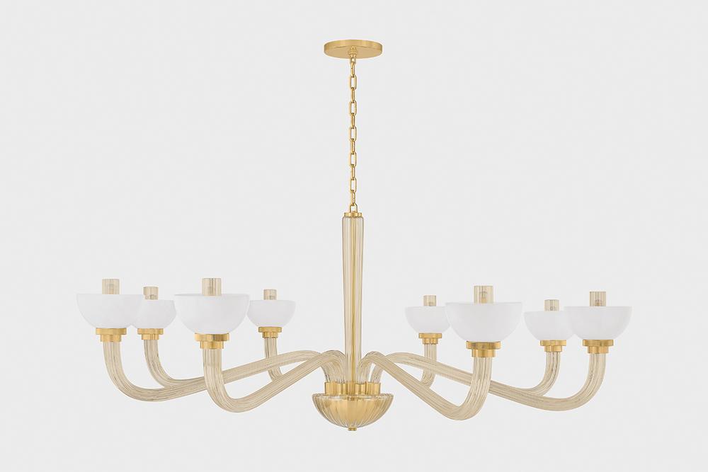 Vintage-inspired shaping, layered glass, and sophisticated finishes elevate the surprising silhouettes of the St. Lawrence family. Offering contemporary interpretations of classic motifs, the fluted champagne glass branches extend into upturned bowl-shaped opal seedy glass shades. Sleek Aged Brass metalwork complements the retro forms. St. Lawrence is available as a 1-light sconce or 6 or 8-light chandelier.