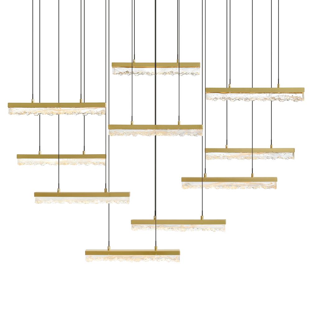 Elevate your space with the Stagger 48" Brass LED Chandelier, a stunning modern ceiling light fixture featuring textured handmade glass for a touch of artisanal elegance. Its sleek brass frame and cascading glass design create a striking focal point in dining rooms, living rooms, or kitchen islands. Integrated LED lighting ensures bright, warm illumination while adding a luxurious contemporary vibe. Perfect for those who appreciate refined craftsmanship and bold, statement-making decor.