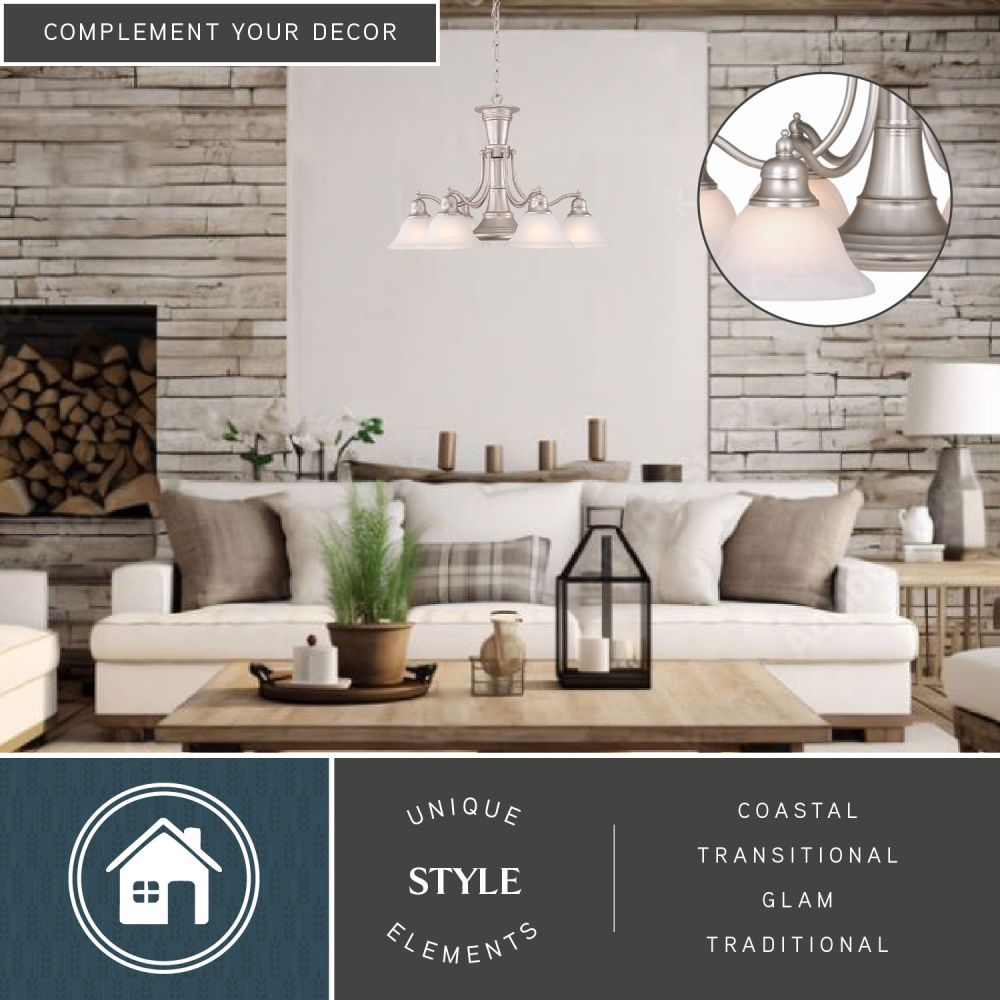 A simple yet sophisticated design is fitting in the traditionally styled Standford collection. It features a brushed nickel finish with white alabaster glass shades. Create a distinguished yet classic look by combining pieces from this extensive series of fixtures. The central column contains an additional bulb controlled separately by an integrated 3-way switch allowing for task down lighting when you need it. This chandelier is ideal for kitchens, dining areas, and foyers.