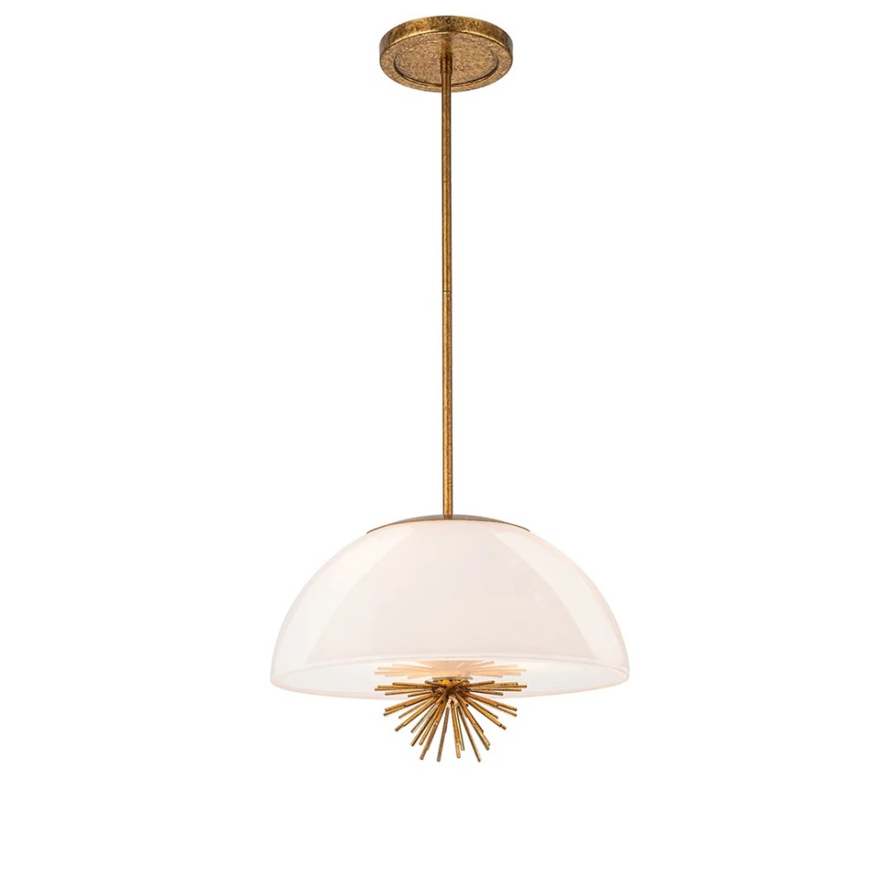 Staring 3 Light: a tri-mount fixture (pendant, flush, or semi-flush) with antiqued gold leaf trim and sputnik accents. Opal white glass with a diffuser ensures even, consistent light.