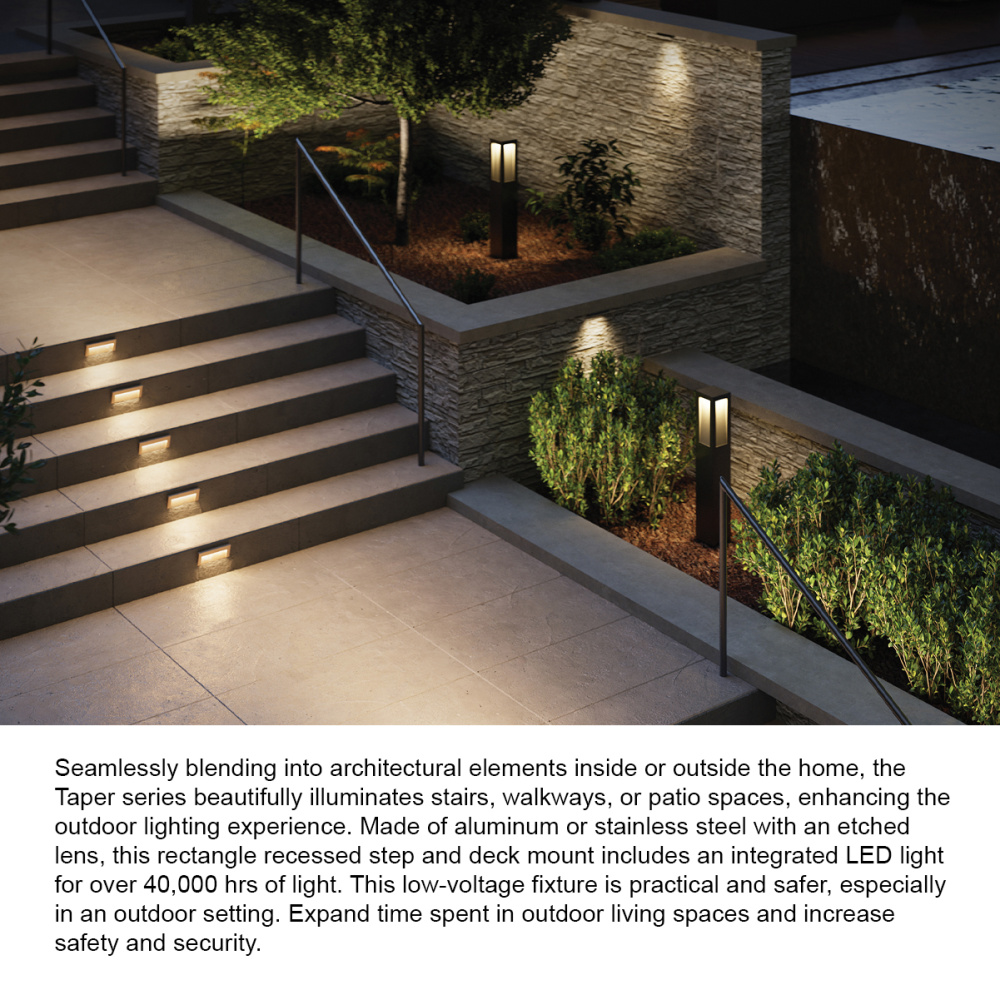 Seamlessly blending into architectural elements inside or outside the home, the Taper series beautifully illuminates stairs, walkways, or patio spaces, enhancing the outdoor lighting experience. Made of aluminum and featuring an etched lens, this rectangle recessed step and deck mount includes an integrated LED light for over 40,000 hrs of light. This low-voltage fixture is practical and safer, especially in an outdoor setting. Expand time spent in outdoor living spaces and increase safety and security. Available in three classic finishes: Bronze, Satin Black, and Satin White.