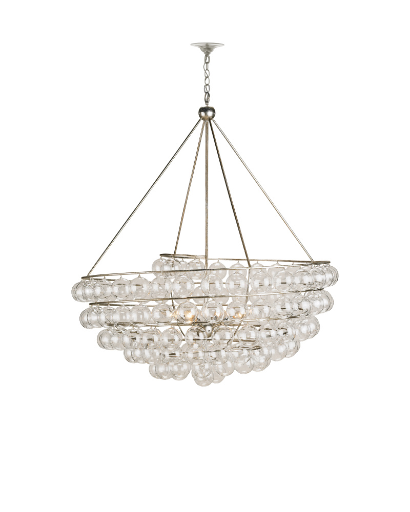 The striking Stratosphere Chandelier makes a brilliant statement, both in size and in the allure reflected from its ethereal elements. Blown glass balls gleam with reflected light as they circle down the simple wrought iron frame. Adding to the sheen of the silver pendant is a contemporary silver leaf finish. Adjustable from 59" to 126" with use of included chain/rod kit/cable. If your space calls for a longer drop, additional chain/rods/cable is available for purchase.