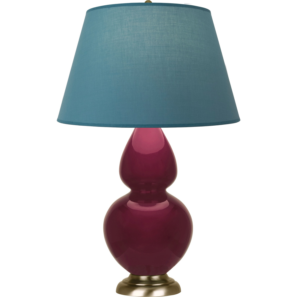 Sugar Plum Glazed Ceramic with Antique Natural Brass Finished Accents Double Gourd Table Lamp with Bright Blue Fabric Shade with Gray Lining - Our Double Gourd collection features a simple but gracefully curving silhouette. Available in a wide array of vibrant colors and several different base finishes.