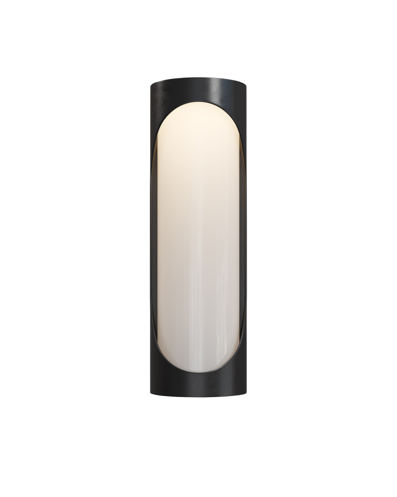 The Swale Large Outdoor Wall Sconce has a graphic silhouette with cut outs where illumination can escape. The front of the black sconce is covered with a milky white glass that illuminates uniformly when the integrated LEDs shine through it. The metal is powdercoated to make this outdoor sconce weather worthy.
