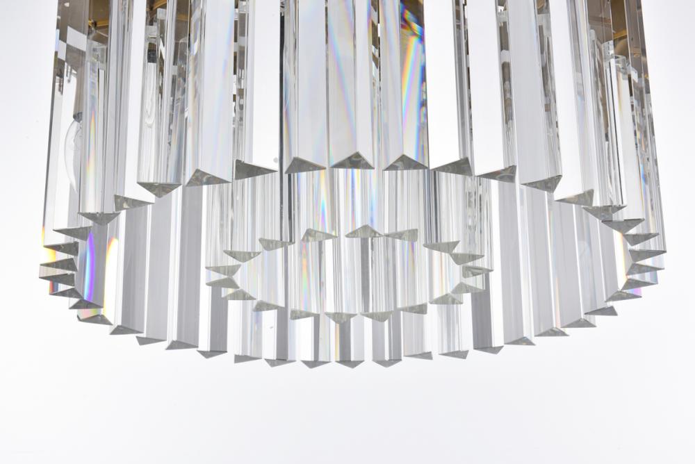 The chandelier features multiple tiers of triangular slender crystal rods, providing a stunning cascade of shimmering light and creating a sense of opulence.