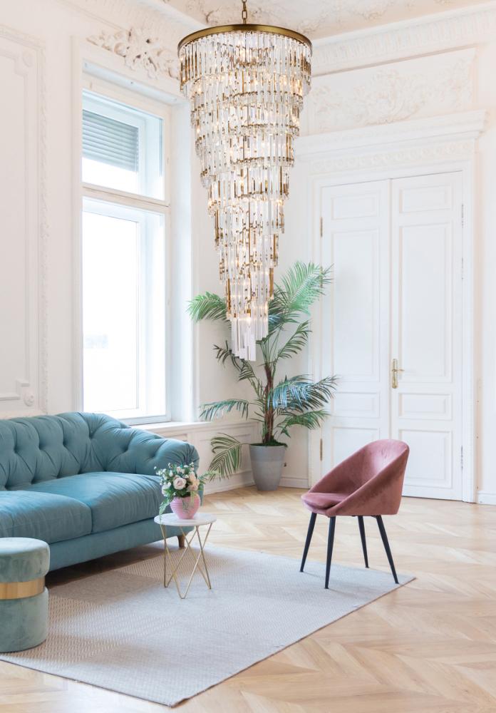 The interplay between the crystals and the light bulbs creates a dazzling effect, casting an enchanting glow throughout the room.