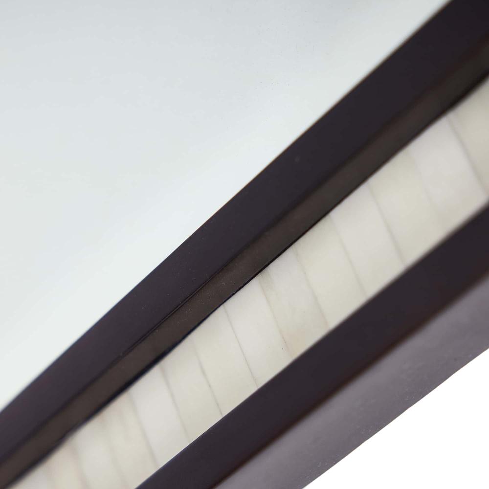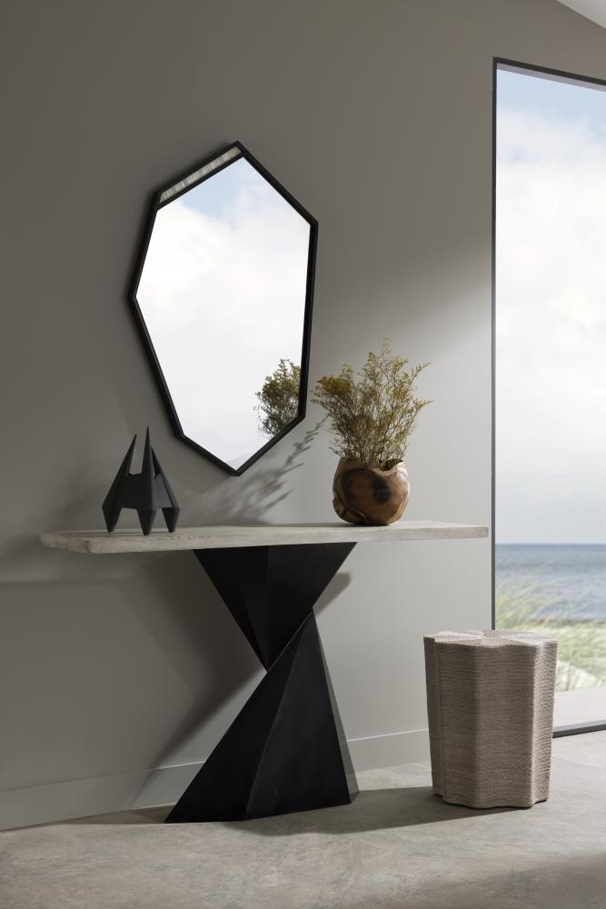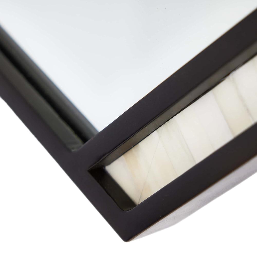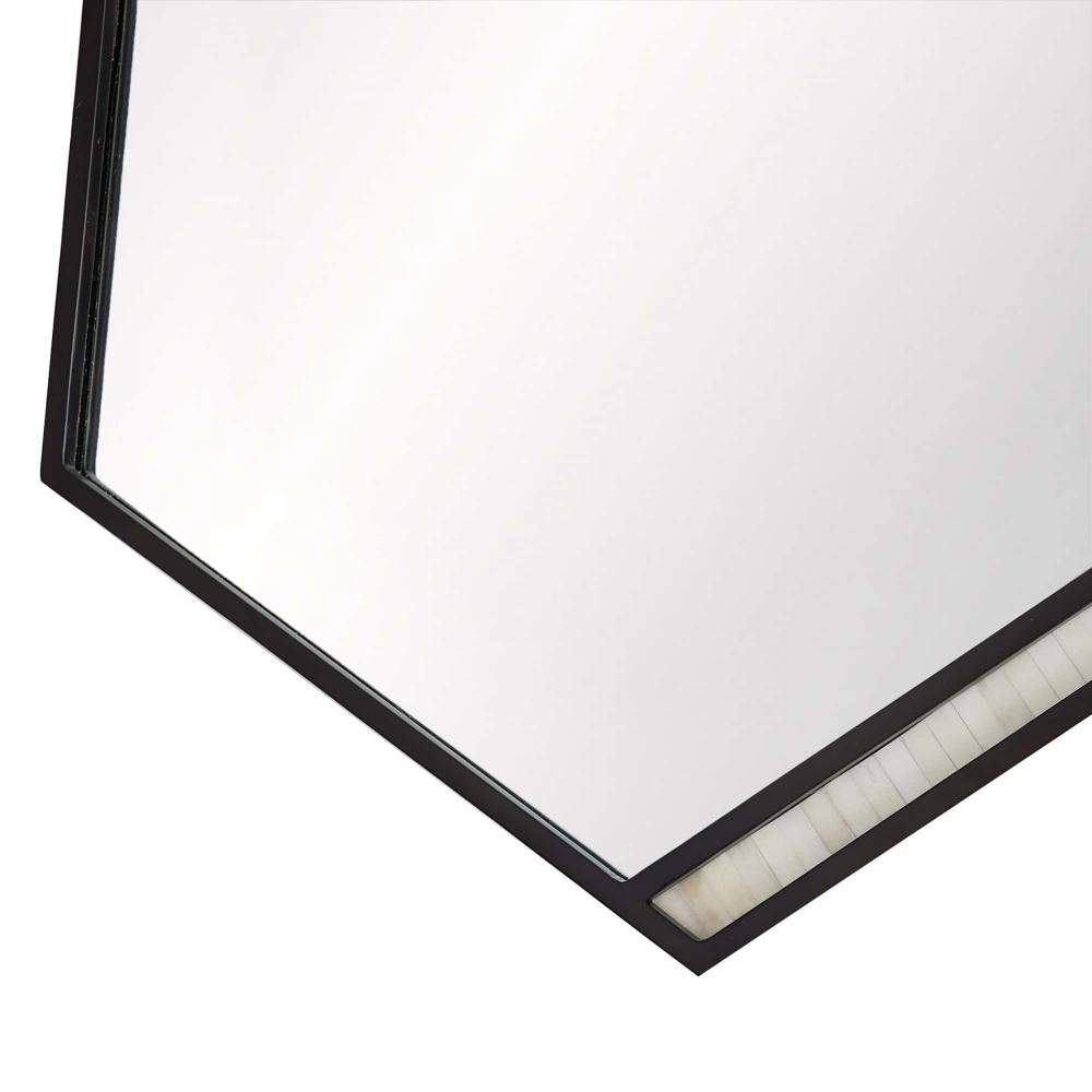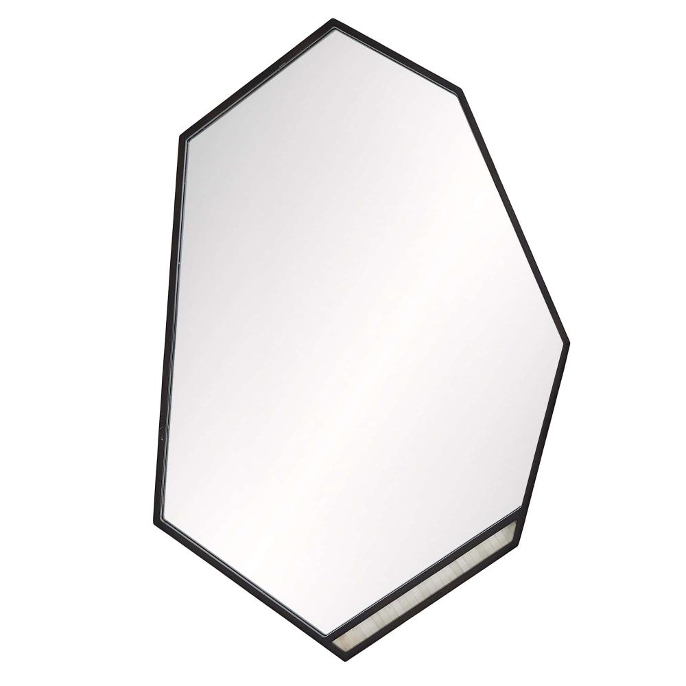 THE TALLAND, WITH ITS BOLD, ANGULAR SILHOUETTE, IS REMINISCENT OF A SOLDIER’S SHIELD. DETAILED WITH A CONTRASTING STRIP OF NATURAL BONE INLAY, THE FACETED, BRONZE IRON FRAMED MIRROR CUTS A STRIKING REFLECTION. THE WALL MIRROR IS FITTED WITH A CLEAT FOR HANGING. FINISH WILL VARY.