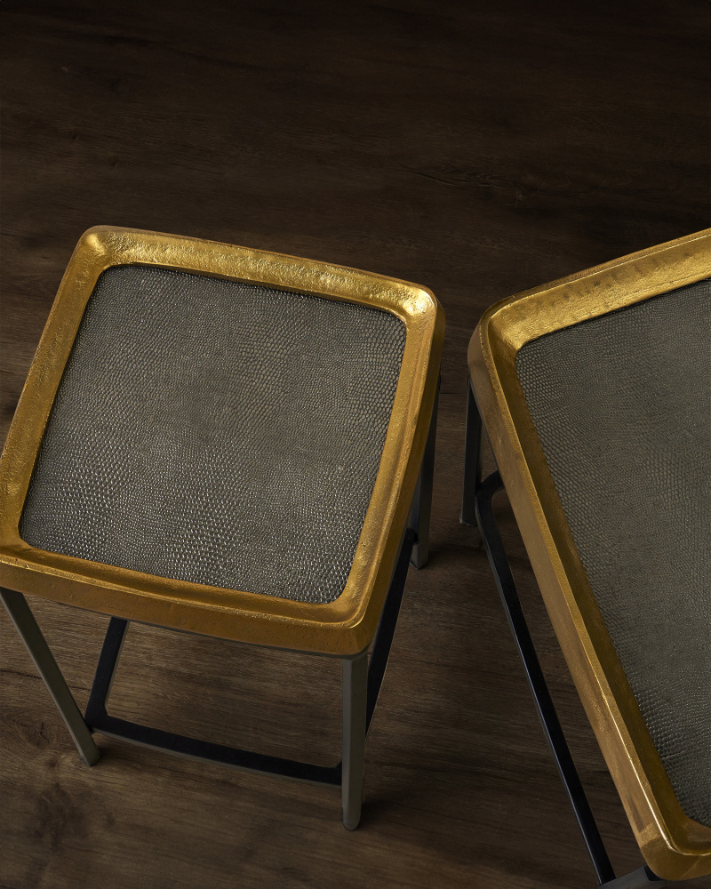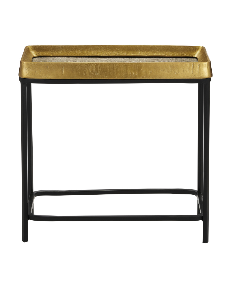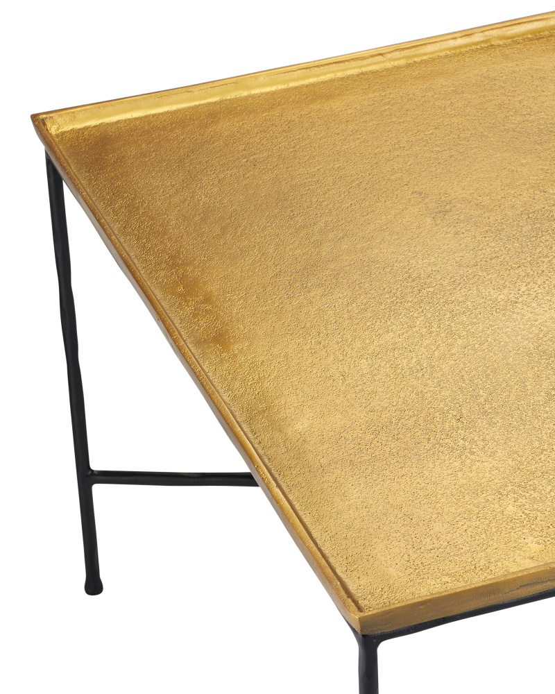 The Tanay Brass Side Table is not shy when it comes to infusing a space with an incredible mix of textures. Not only does the cast aluminum top have tell-tale pitting on the surfaces of its gleaming gold interior and exterior edge, the bottom of its tabletop is stamped in a snakeskin pattern in a graphite finish. This masterpiece of artistry sits atop a black iron base that is minimal to allow the artisanal top to be the scene-stealer.