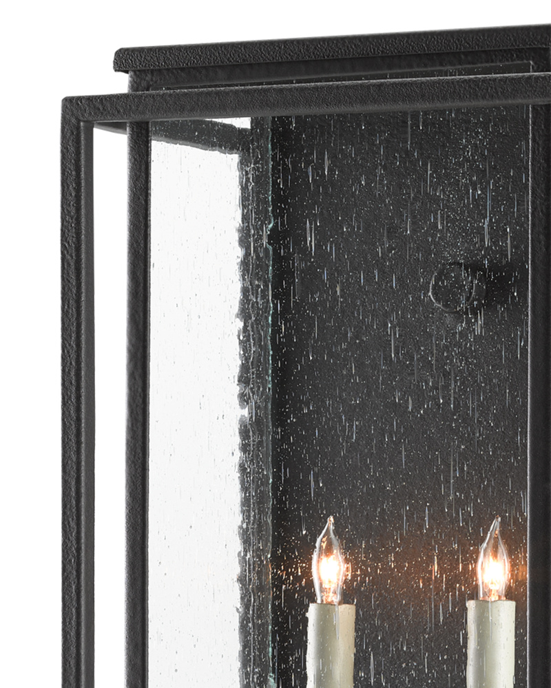 The Tanzy Medium Outdoor Wall Sconce in our Twelfth Street collection of outdoor lighting features a high-performance, weather-resistant Trilux finish that is fade resistant, crack resistant and rust resistant. We guarantee the finishes applied to our Twelfth Street pieces for five years. The metal on this black post light in a midnight finish surrounds seeded-glass panes. It is certified for outdoor and damp locations.