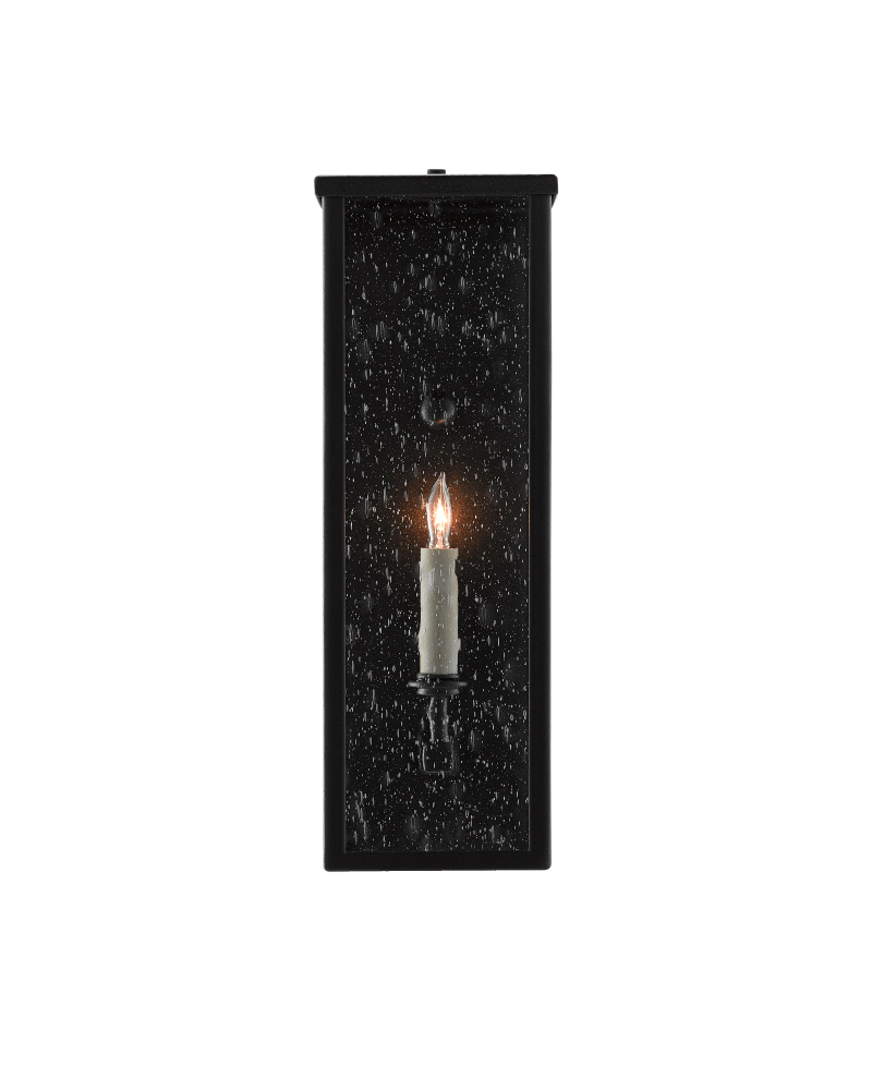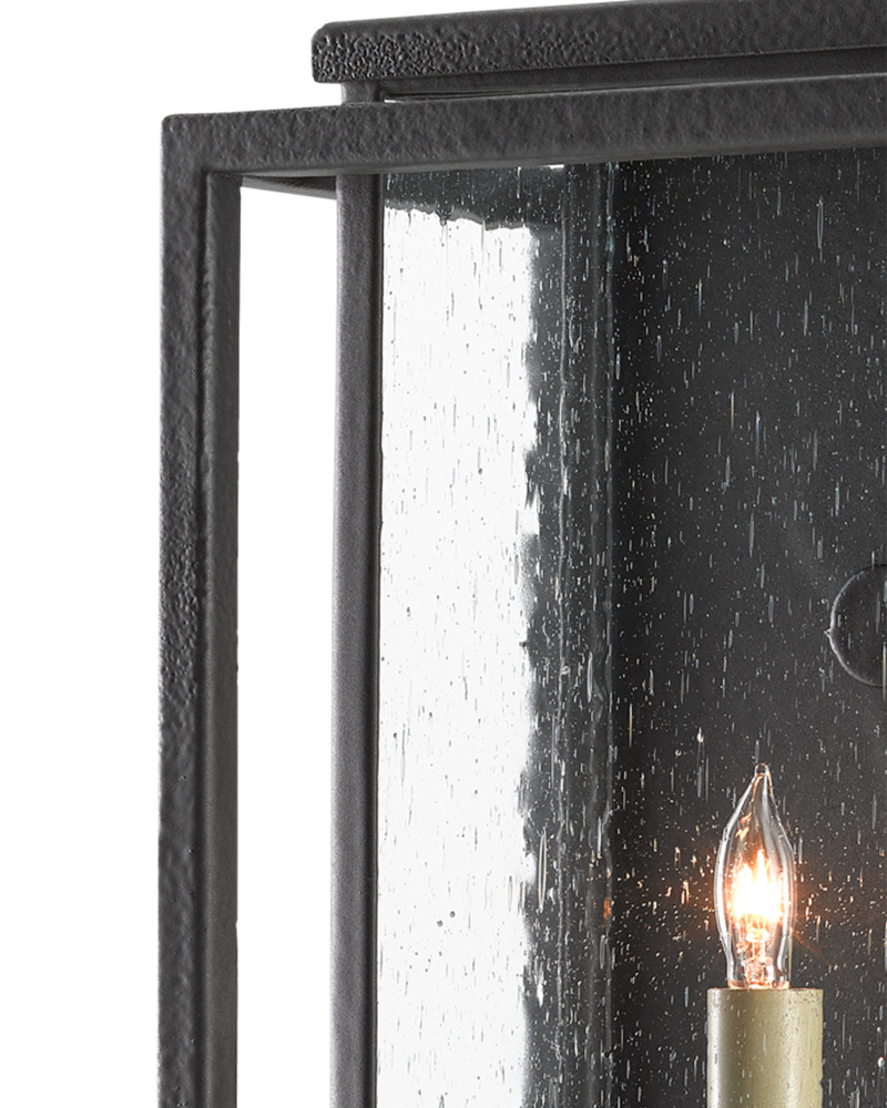 The Tanzy Small Outdoor Wall Sconce in our Twelfth Street collection of outdoor lighting features a high-performance, weather-resistant Trilux finish that is fade resistant, crack resistant and rust resistant. We guarantee the finishes applied to our Twelfth Street pieces for five years. The metal on this black post light in a midnight finish surrounds seeded-glass panes. It is certified for outdoor and damp locations.