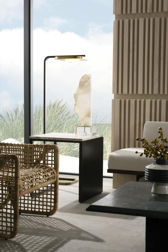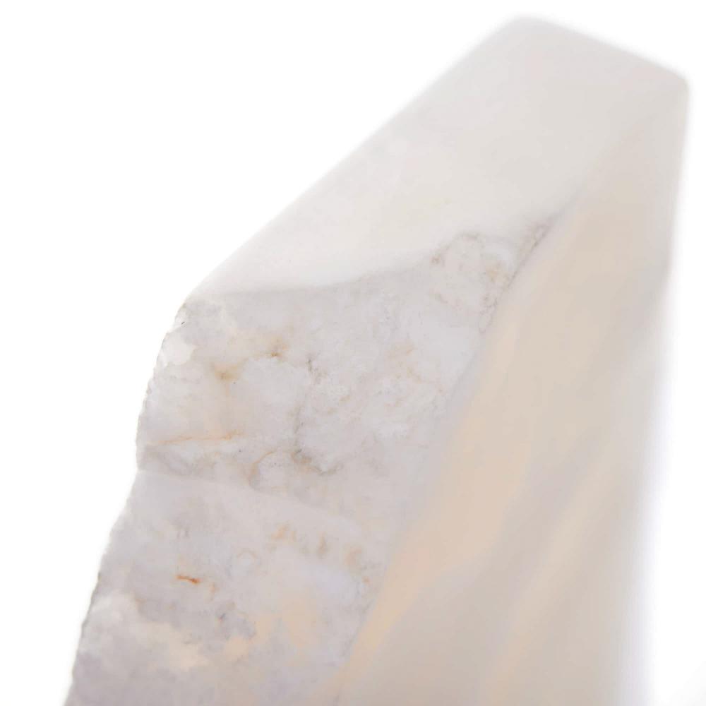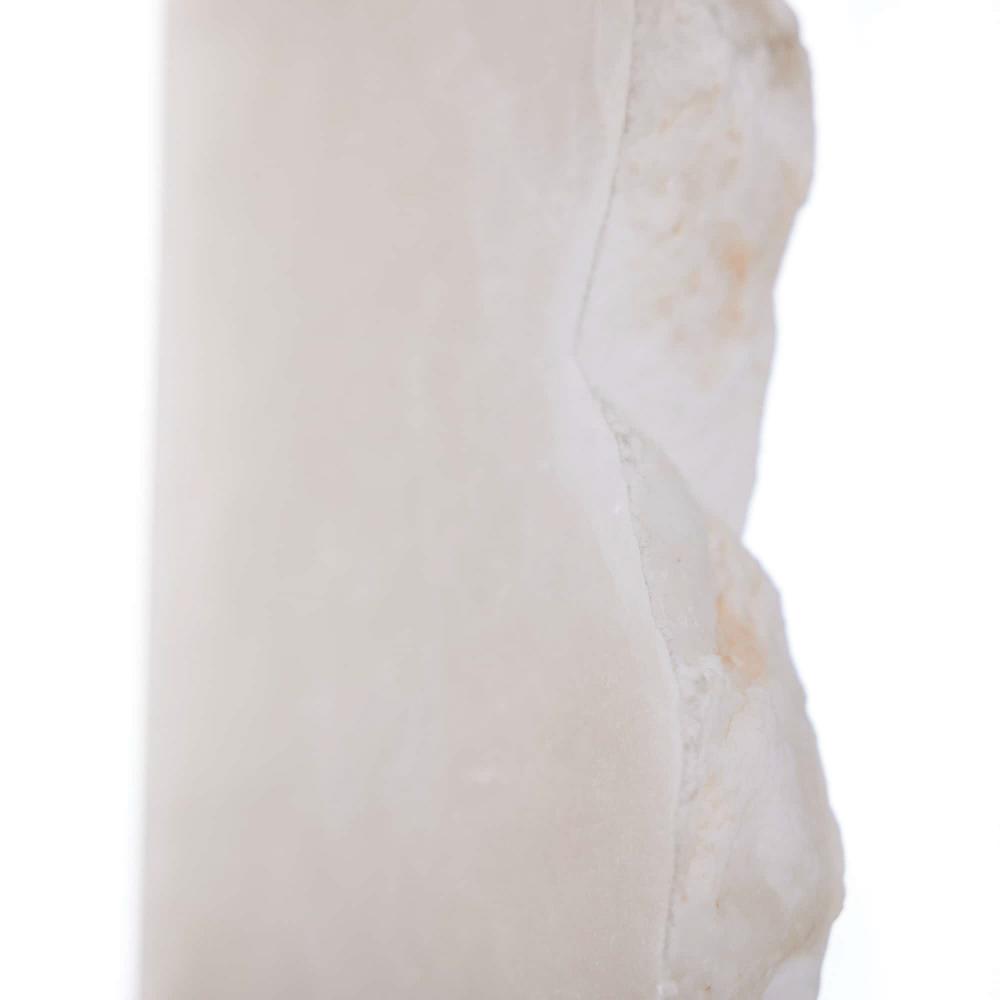 DRAWING INSPIRATION FROM 20TH CENTURY MODERNISM, THE TAOS SCULPTURE IS CHISELED FROM WHITE ALABASTER TO REVEAL A CRAGGY, RAW EDGE ON ONE SIDE AND A SMOOTH, VERTICAL PLANE ON THE OTHER. A ANTIQUE BRASS STEEL PLATE TOPS THE TRANSLUCENT CRYSTAL BASE. FINISH WILL VARY.
