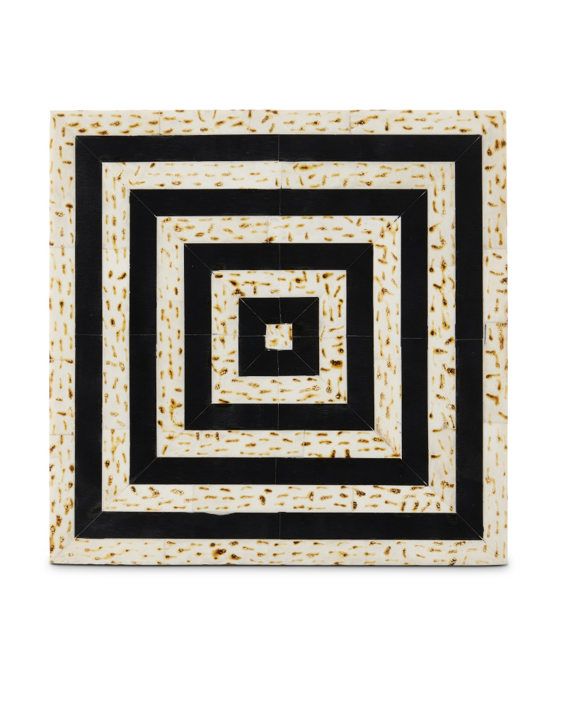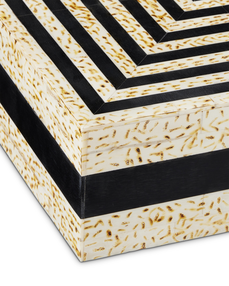 The Taurus Box Set has a number of artisanal aspects to its design and construction, one of which is how the handmade ivory and black decorative boxes have mitered corners that follow the line telescoping from their tops to their bottoms. Once the bone and composite materials have been fitted together in tidy lines, texture is achieved on the surface when artisans mark the white speckled bone with a brazing tool. This level of specificity and the fact that the boxes are composed like intricate puzzles bring complexity to these artisanal accessories.