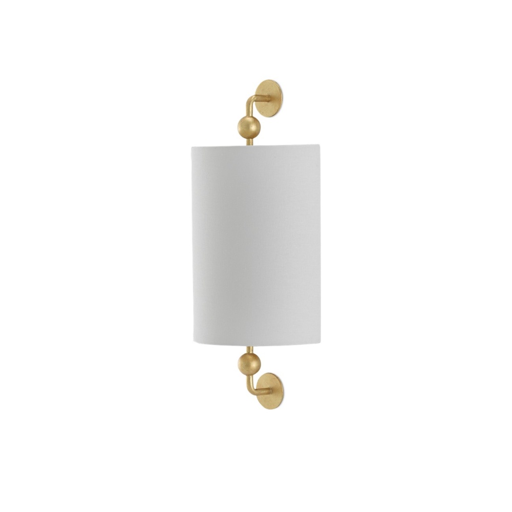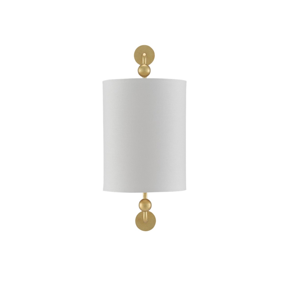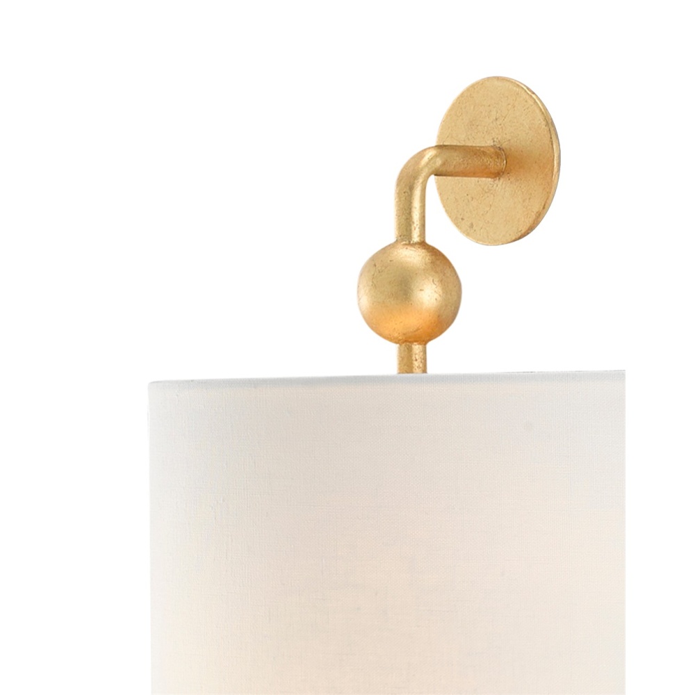 Tiny globes ornament the arms that affix the off-white linen shade to the Tavey Gold Wall Sconce. Made of wrought iron in a contemporary gold leaf finish, the stylish gold sconce meets ADA requirements.