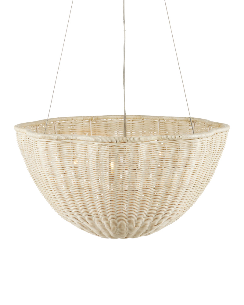 The Telos Pendant is made of wicker that has been bleached for a lighter feel. The beige pendant is perfect for spaces where an abundance of uplight is needed. The wicker pendant with its bowl-shaped profile is scalloped, though this is not obvious when viewed from the side. Given the nature of the woven natural material, pinpoints of light will waft through in spots. Adjustable from 28" to 128" with use of included chain/rod kit/cable. If your space calls for a longer drop, additional chain/rods/cable is available for purchase.