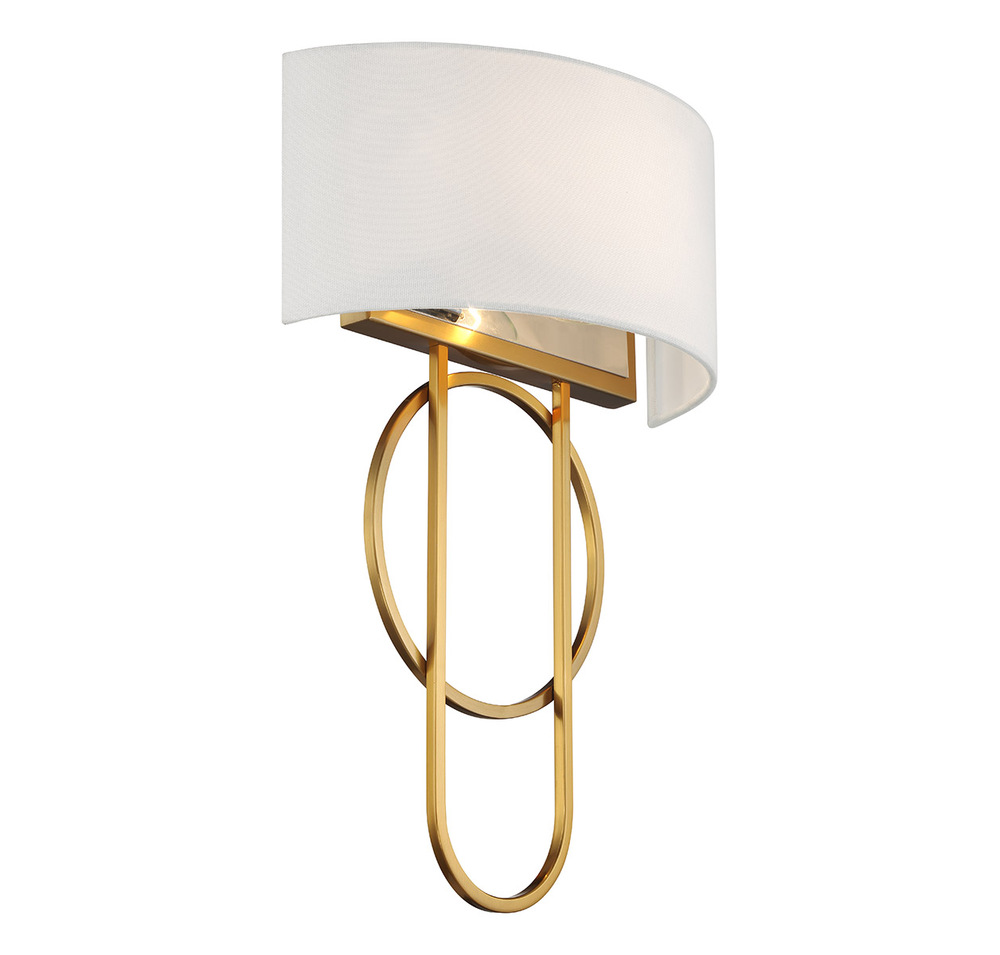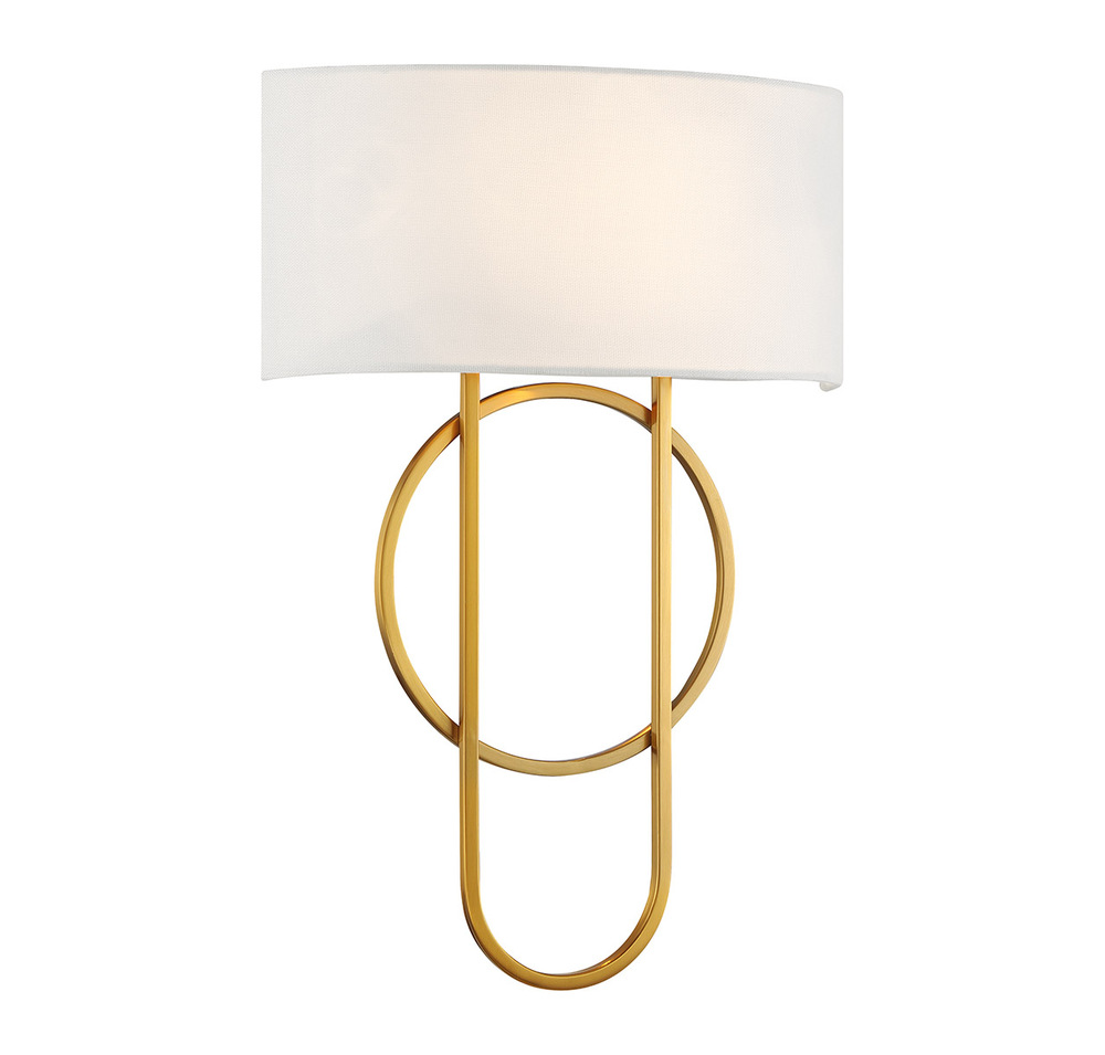 With a subtly stylish design featuring overlapping geometric shapes, the Savoy House Tempe 2-light sconce is a great way to boost the illumination and appeal in any room. The slim shapes, finished in Warm Brass, contrast beautifully with the crisp white linen shade. Tempe is 17" in height, 12" in width and extends 4.75" from the wall. Uses two candelabra size bulbs of up to 60 watts per bulb. Bulbs not included.