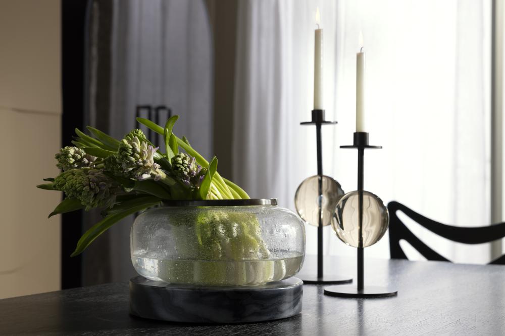 MOODY AND MODERN, THIS PAIR OF CANDLEHOLDERS FEATURE DISCS OF CHAMPAGNE CRYSTAL SUSPENDED AMID BRONZE-FINISHED STEEL STEMS AND ROUND BASES. TOP ANY SURFACE WITH THE MIXED-MEDIA TAPER-HOLDERS FOR A SOFT LAYER OF ILLUMINATION.
